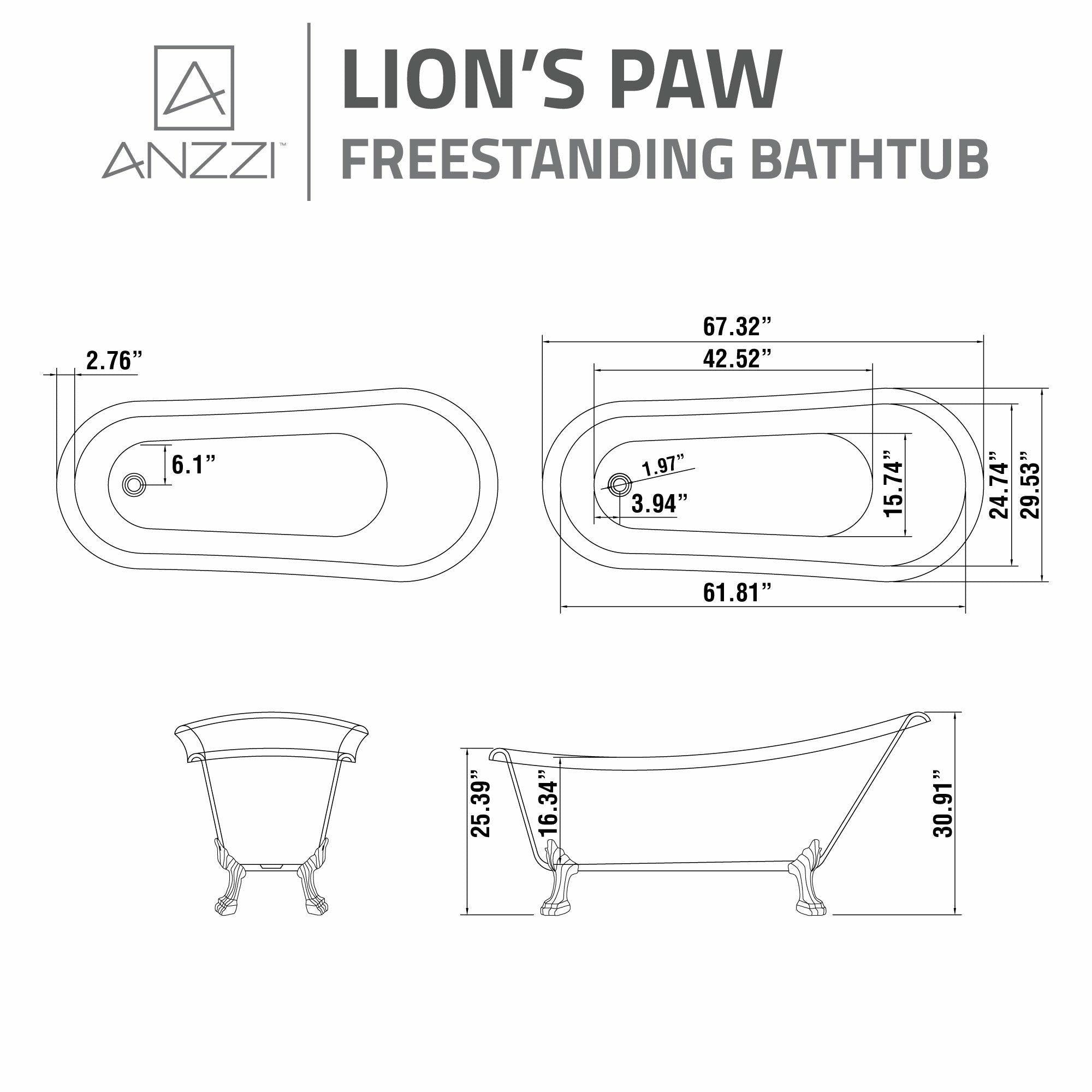 Our classically inspired Diamante tub brings a flair for the dramatic, telling one and all that yours is no ordinary bathroom. The high-backed slipper-style design comfortable supports all body types. Striking steel claw feet hide built-in levelers. An overflow drain has been conveniently pre-installed. All this expert craftsmanship is backed by a limited lifetime warranty, so you can soak away securely with no worries for years to come.