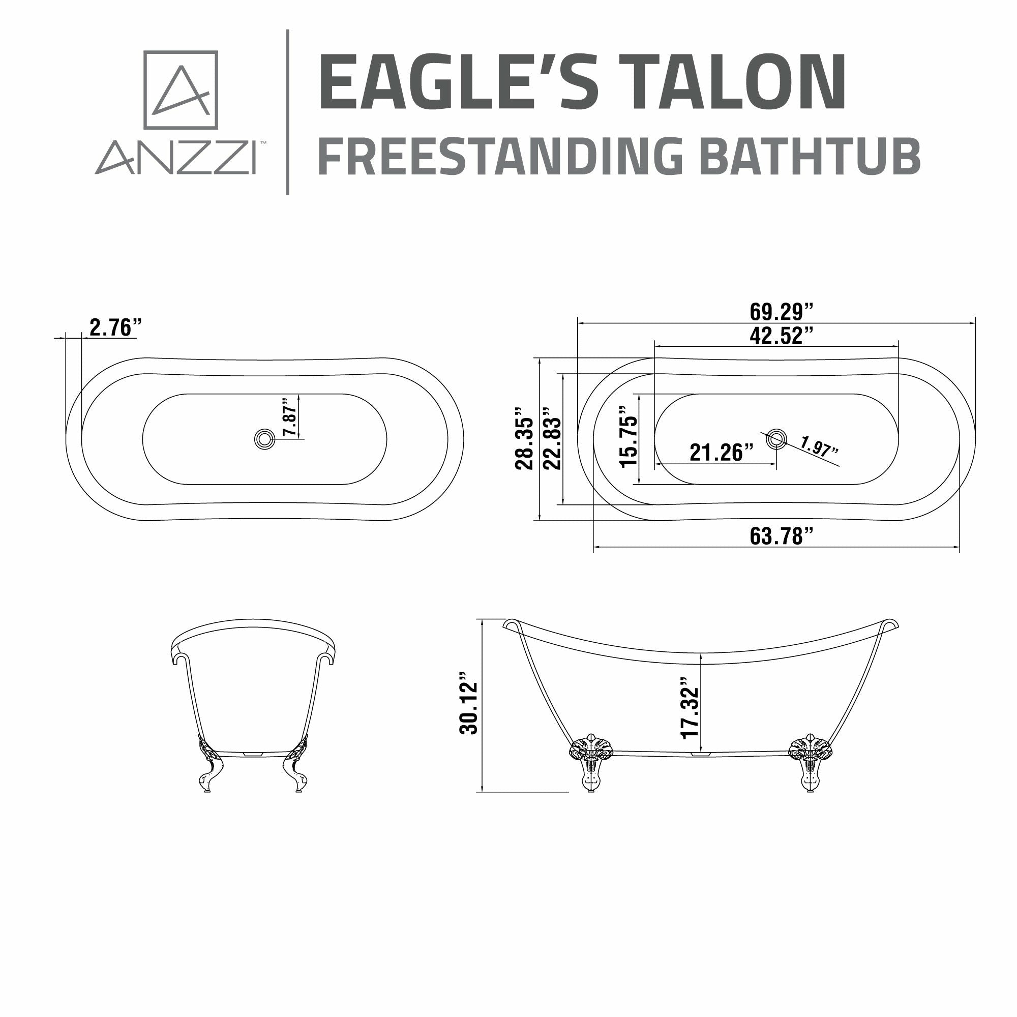 69.29” Belissima Double Slipper Acrylic Claw Foot Tub in White