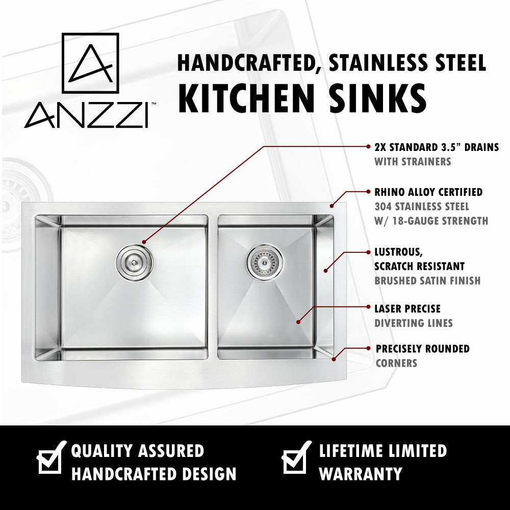 ANZZI presents the 33 in. ELYSIAN SERIES hand crafted farmhouse kitchen sink. Representing the latest in modern home fixture designs and traditional European crafting technique this stunning display of artistry is hand shaped to perfection using RHINO ALLOY certified 18-Gauge 304 stainless steel. Only ANZZI hand crafted farmhouse kitchen sinks utilize RHINO ALLOY certified materials for superior strength and quality. The cavernous 60/40 deep soaking dual basin will comfortably accommodate the largest dish loads including pots, pans and more. And every ANZZI sink features extra-large Echo-STOP sound dampening pads and a layer of protective composite coating to further quiet noise and prevent condensation. We have paired this sink with the ANZZI Soave Kitchen Sink Faucet. Each ANZZI faucet has been certified as Water Sense approved with solid brass construction and valve included. Well defined diversion lines ensure quick and total water drainage and the subtly curved corners allow of easier cleaning. ANZZI carries a proud tradition of crafting long lasting, quality home fixtures. With ANZZI perfection is our tradition.