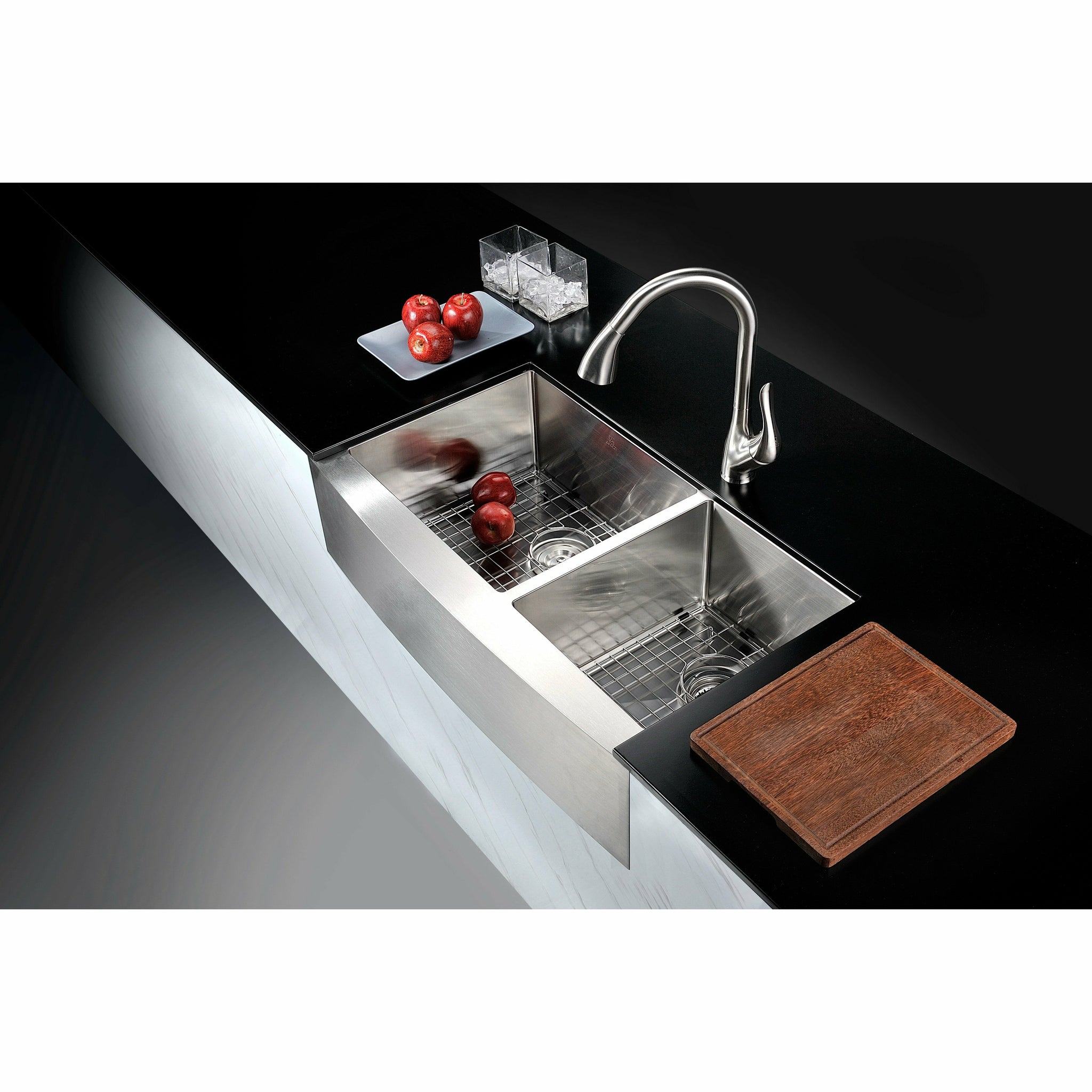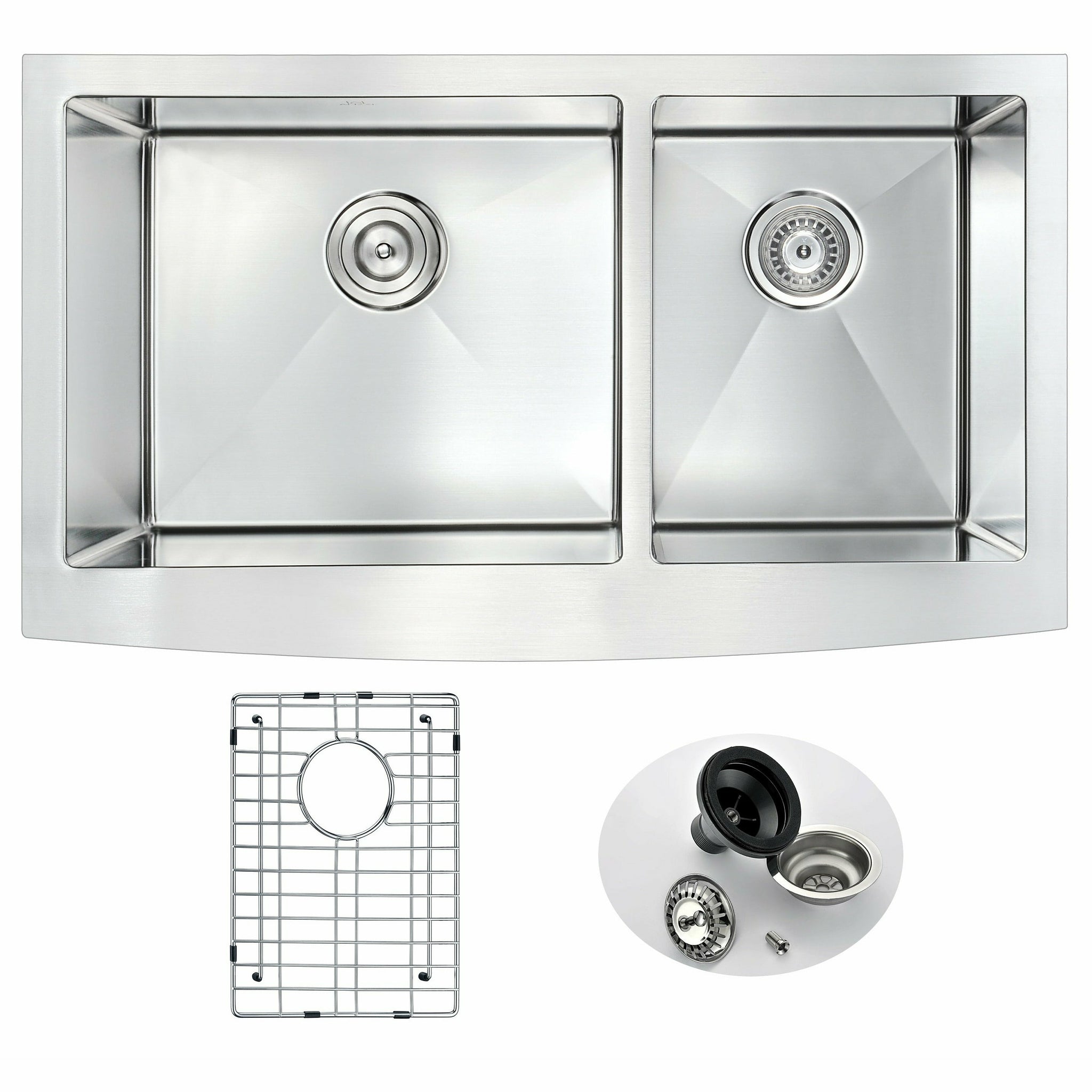 Elysian Farmhouse Stainless Steel 36 in. 0-Hole 60/40 Double Bowl Kitchen Sink in Brushed Satin