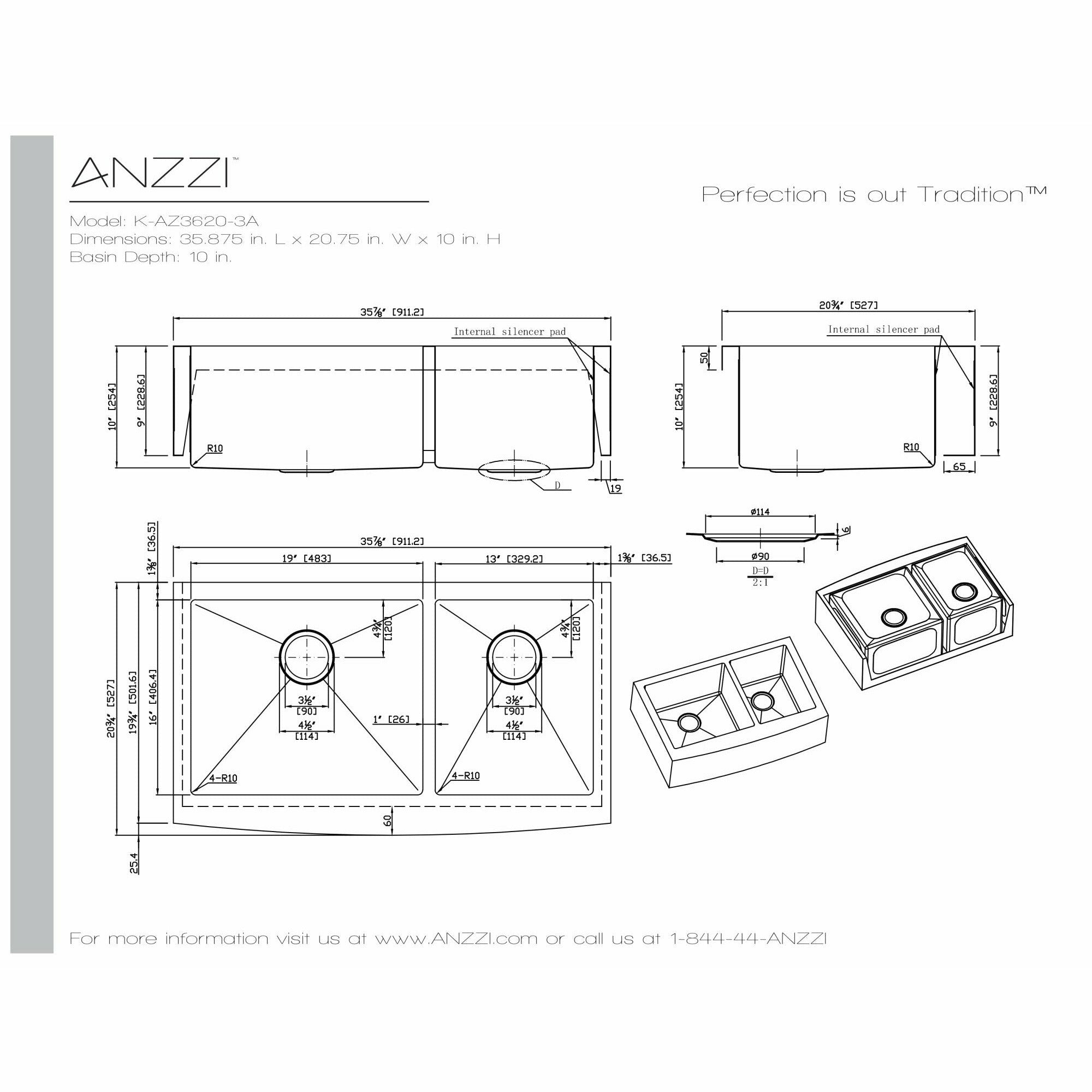 ANZZI presents the 36 inch ELYSIAN SERIES hand crafted farmhouse kitchen sink. Representing the latest in modern home fixture designs and traditional European crafting technique this stunning display of artistry is hand shaped to perfection using RHINO ALLOY certified 18 gauge 304 stainless steel. Only ANZZI hand crafted farmhouse kitchen sinks utilize RHINO ALLOY certified materials for superior strength and quality. The cavernous 60/40 deep soaking dual basin will comfortably accommodate the largest dish loads including pots, pans and more. And every ANZZI sink features the largest Echo-STOP sound dampening pads available and a layer of protective composite coating to further quiet noise and prevent condensation. Well defined diversion lines ensure quick and total water drainage and the subtly curved corners allow of easier cleaning. ANZZI carries a proud tradition of crafting long lasting, quality home fixtures. With ANZZI perfection is our tradition.
