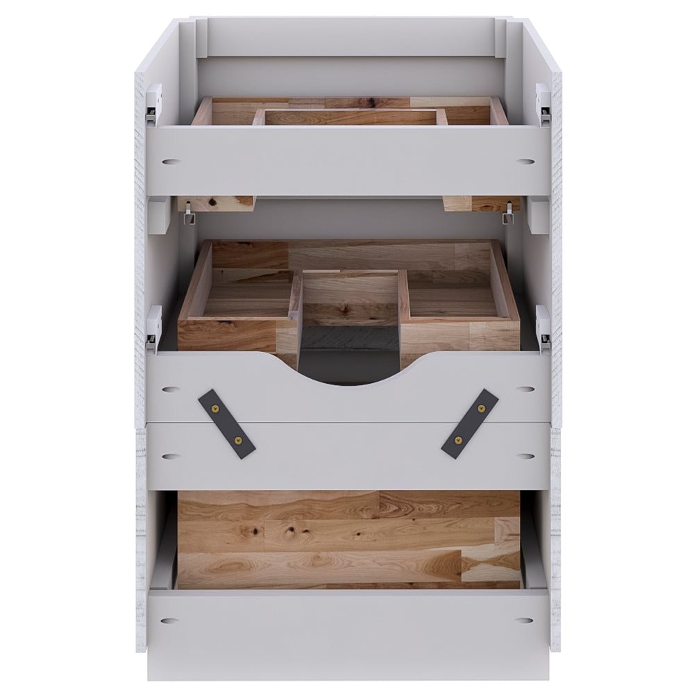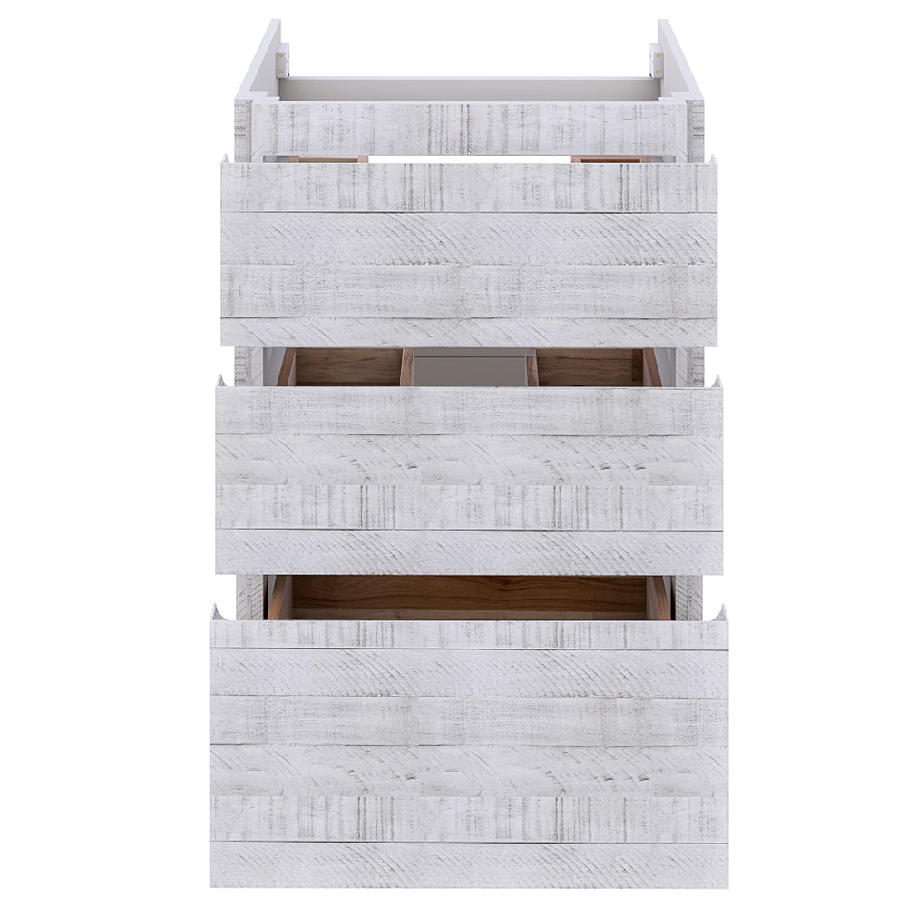 The Fresca Formosa Floor Standing Modern Bathroom Cabinet is superbly crafted of solid Acacia wood, known for its magnificent beauty and durability. It has a warm grey finish with a hint of brown throughout, and a natural grain that will inject luxurious warmth into any space. A masterpiece of elegance and style, this free-standing cabinet measures 23” in width. Three solid wood, soft-closing dovetail drawers are perfect for organizing all of your daily essentials. While the first two drawers provide plenty of space, the third drawer is deeper with full storage capacity. The solid pine drawers are clear coated and feature a mitered, wrap-around design that adds to the superior detailing. Cove routed pulls are carved directly into the drawers keeping the design sharp and sophisticated. The Fresca Formosa Cabinet is available in multiple sizes and styles. It includes installation hardware.