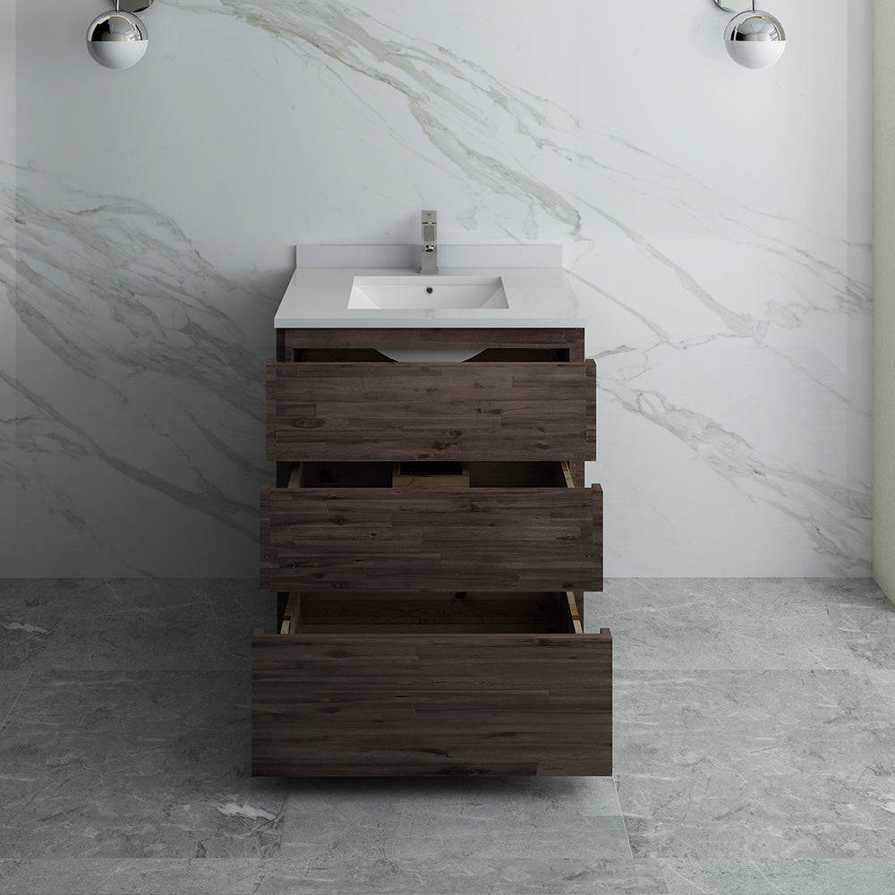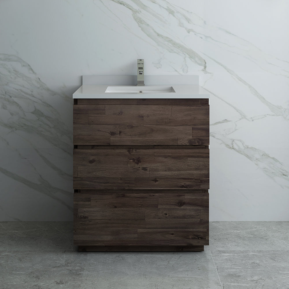 The Fresca Formosa 30" Wall Hung Modern Bathroom Cabinet w/ Top & Sink is superbly crafted of solid Acacia wood, known for its magnificent beauty and durability. It has a warm grey finish with a hint of brown throughout, and a natural grain that will inject luxurious warmth into any space. Two solid wood, soft-closing dovetail drawers are perfect for organizing all of your daily essentials. The solid pine drawers are clear coated and feature a mitered, wrap-around design that adds to the superior detailing. Cove routed pulls are carved directly into the drawers keeping the design sharp and sophisticated. Gracing the top of the cabinet is a stunning quartz stone countertop and ceramic undermount basin. The white ceramic basin has a smooth, contoured design, while the gorgeous quartz stone countertop has clean, square edges. The basin is equipped with an overflow and the countertop has been pre-drilled to accommodate a single hole faucet (sold separately). The Fresca Formosa Cabinet with Top & Sink is available in multiple sizes and styles. It includes installation hardware.