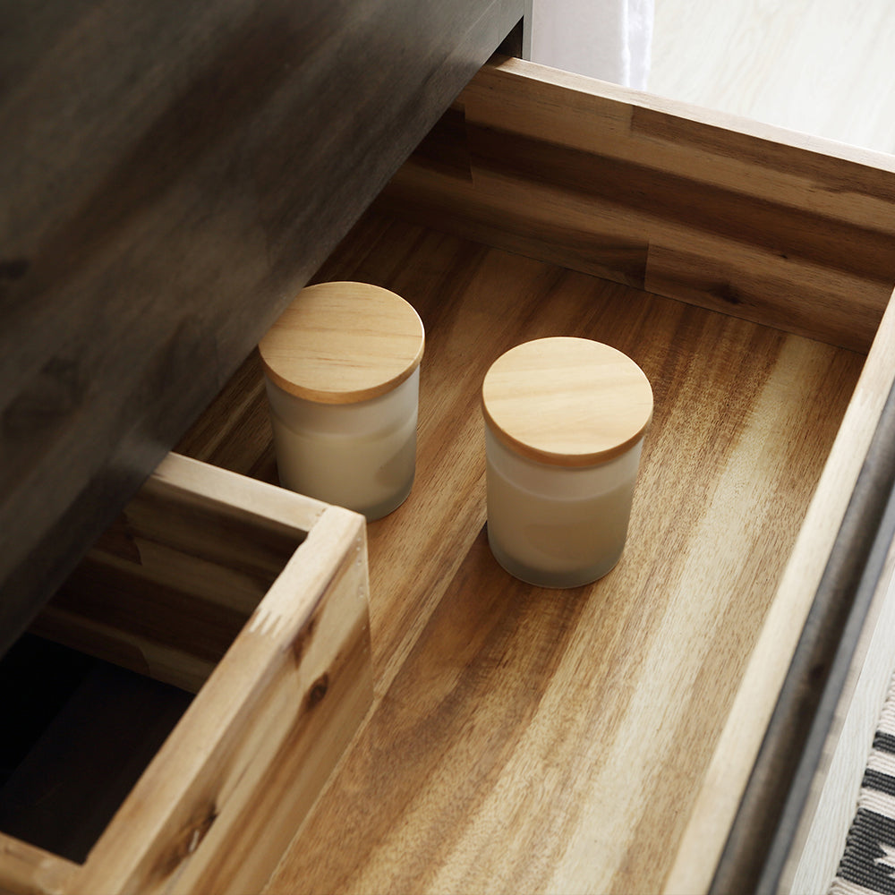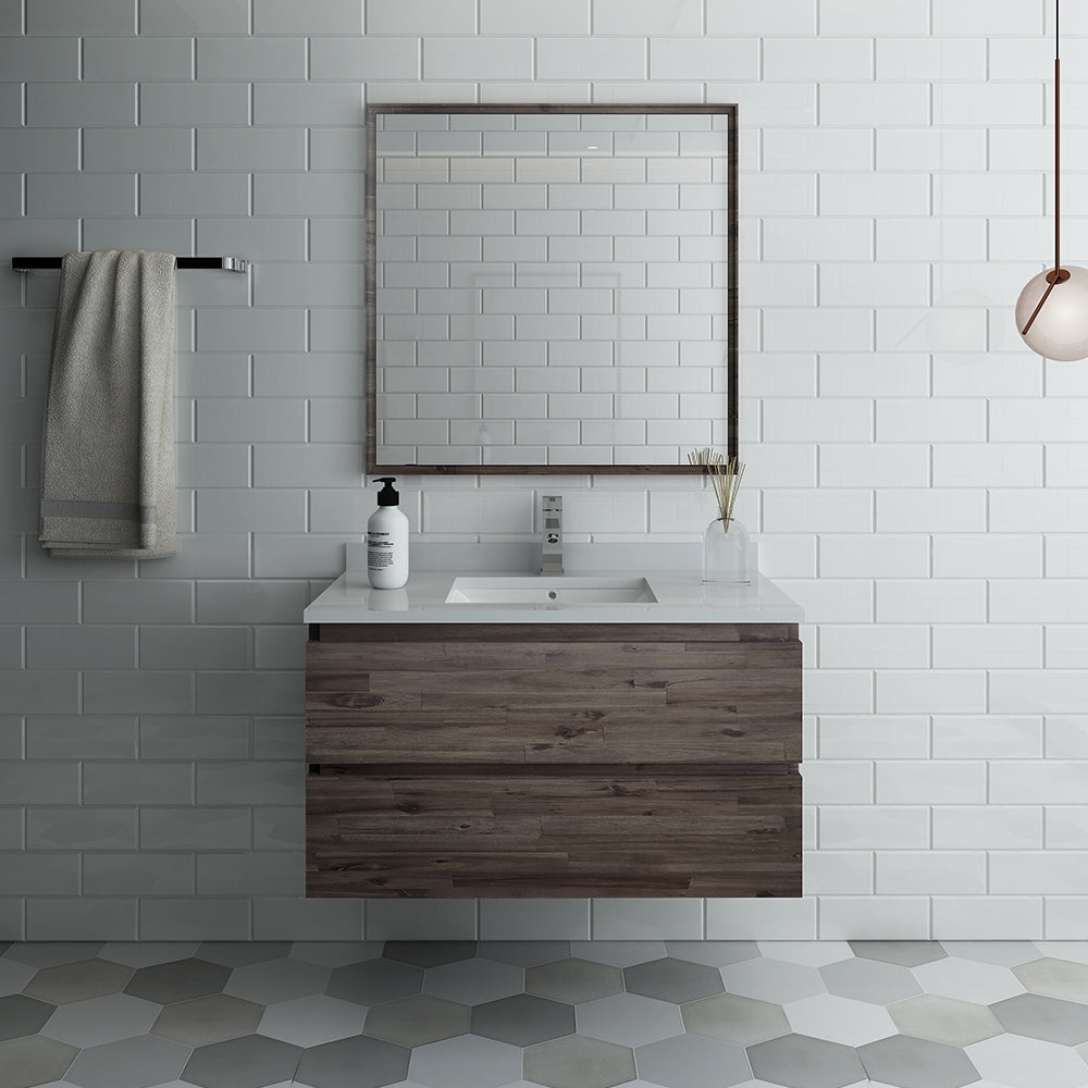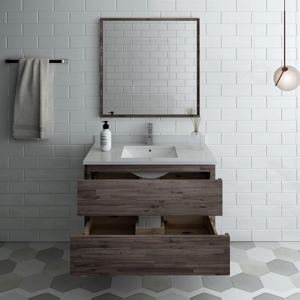 The Fresca Formosa Wall Mount Bathroom Vanity is superbly crafted of solid Acacia wood, known for its magnificent beauty and durability. It has a warm grey finish with a hint of brown throughout, and a natural grain that will inject luxurious warmth into any space. A masterpiece of elegance and style, this wall-mounted vanity measures 36” in width. Two solid wood, soft-closing dovetail drawers are perfect for organizing all of your daily essentials. The solid pine drawers are clear coated and feature a mitered, wrap-around design that adds to the superior detailing. Cove routed pulls are carved directly into the drawers keeping the design sharp and sophisticated. Gracing the top of the vanity is a stunning 36” quartz stone countertop and ceramic undermount basin. The white ceramic basin is equipped with an overflow and the countertop has been pre-drilled to accommodate the faucet of your choice. A p-trap, pop-up drain and installation hardware are included. This Formosa Wall Mount Bathroom Vanity comes with a matching 30” Acacia Mirror with a frame that is cove routed and mitered, providing the perfect finishing touch.