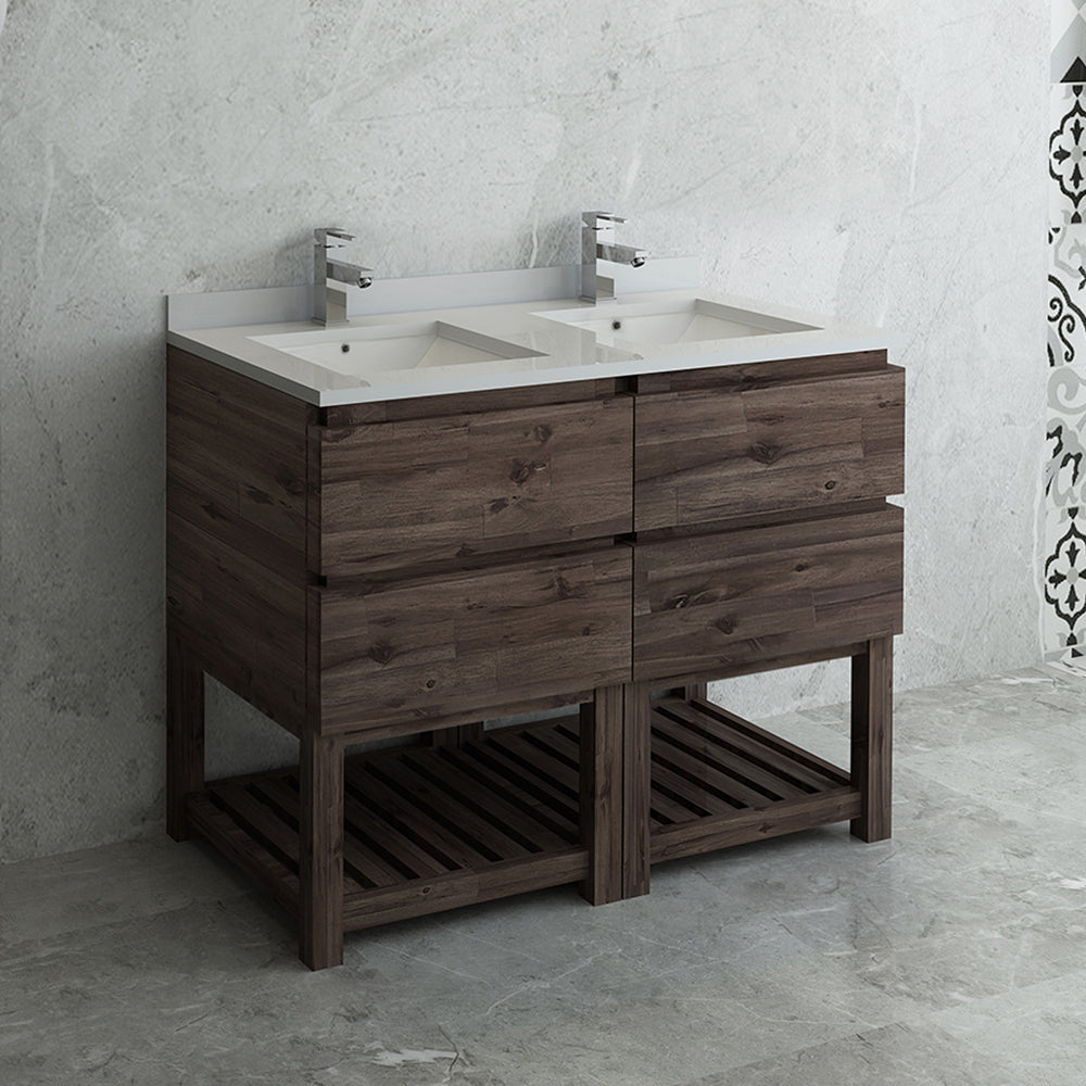The Fresca Formosa Floor Standing Open Bottom Double Sink Slat Modern Bathroom Cabinet is superbly crafted of solid Acacia wood, known for its magnificent beauty and durability. It has a warm grey finish with a hint of brown throughout, and a natural grain that will inject luxurious warmth into any space. A masterpiece of elegance and style, this free-standing cabinet measures 46” in width. With four solid wood, soft-closing dovetail drawers, this bathroom cabinet features tons of storage, ideal for keeping a family organized. The solid pine drawers are clear coated and feature a mitered, wrap-around design that adds to the superior detailing. Cove routed pulls are carved directly into the drawers keeping the design sharp and sophisticated. This handsome cabinet also has an open slatted shelf on the bottom, perfect for storing hand towels or other bathroom necessities. The Fresca Formosa Cabinet is available in multiple sizes and styles. It includes installation hardware.