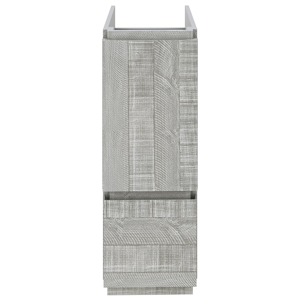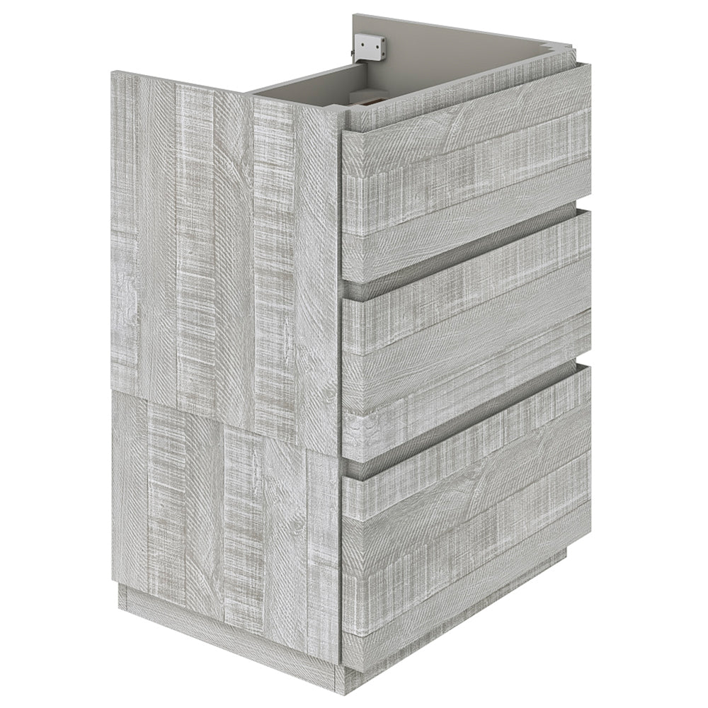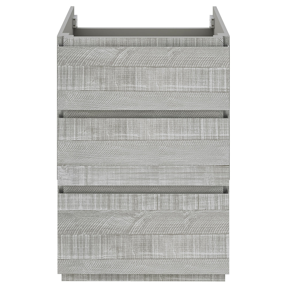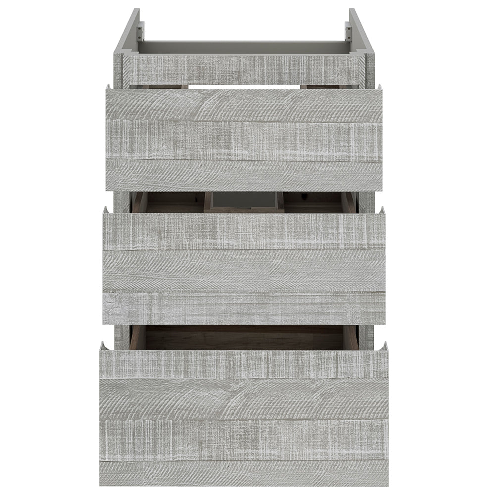The Fresca Formosa Floor Standing Double Sink Modern Bathroom Cabinet is superbly crafted of solid Acacia wood, known for its magnificent beauty and durability. It has a warm grey finish with a hint of brown throughout, and a natural grain that will inject luxurious warmth into any space. A masterpiece of elegance and style, this floor standing cabinet measures 58” in width. With large solid wood, soft-closing dovetail drawers beneath each sink, and a roomy cabinet and drawer at the center of the design, this bathroom cabinet features tons of storage, ideal for keeping a family organized. While all drawers provide plenty of space, the bottom drawers are deeper with full storage capacity. The solid pine drawers are clear coated and feature a mitered, wrap-around design that adds to the superior detailing. Cove routed pulls are carved directly into the drawers and cabinet door, keeping the design sharp and sophisticated. The Fresca Formosa Cabinet is available in multiple sizes and styles. It includes installation hardware.