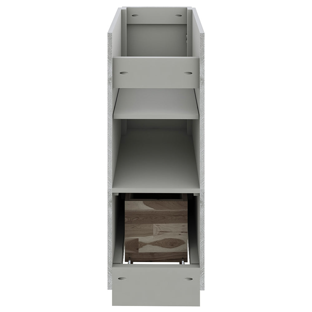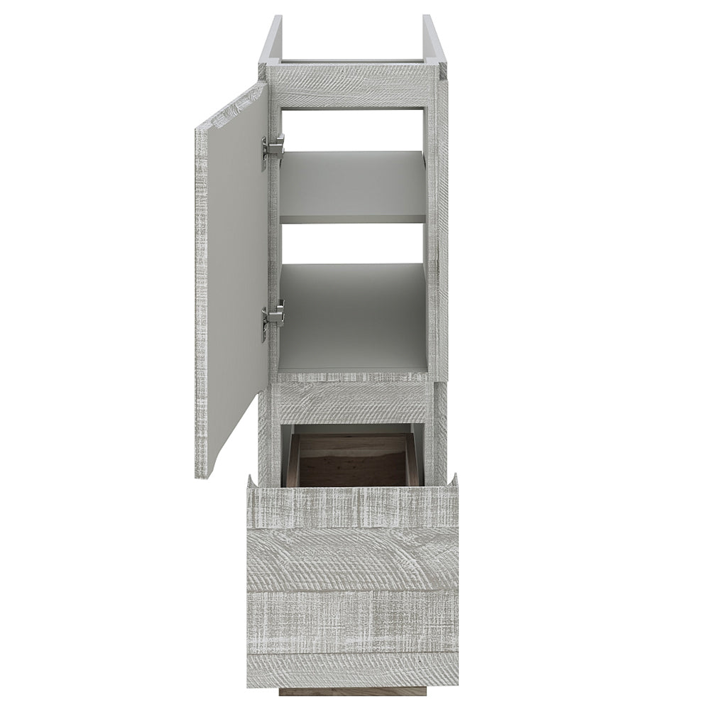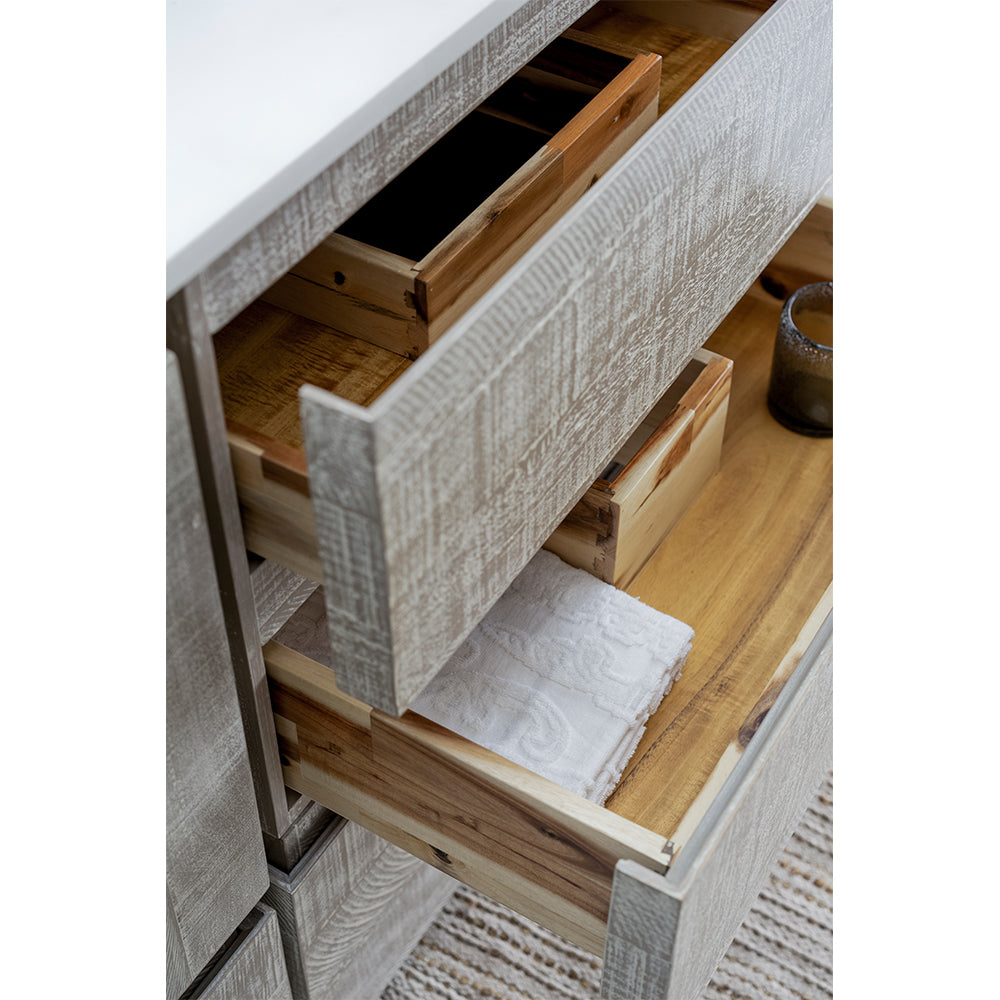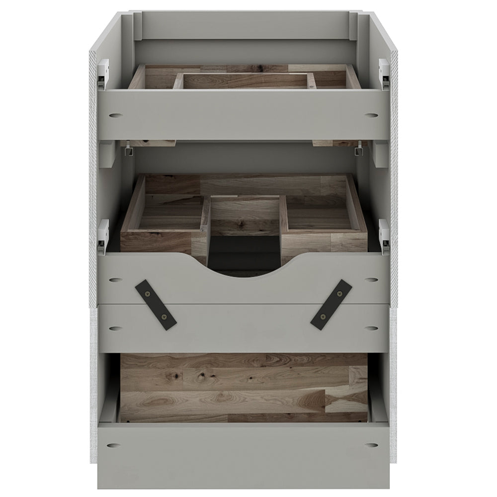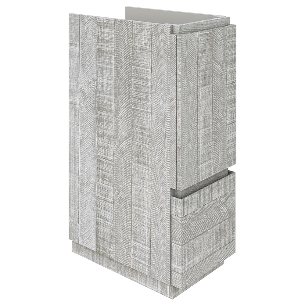 The Fresca Formosa Floor Standing Double Sink Modern Bathroom Cabinet is superbly crafted of solid Acacia wood, known for its magnificent beauty and durability. It has a warm grey finish with a hint of brown throughout, and a natural grain that will inject luxurious warmth into any space. A masterpiece of elegance and style, this floor standing cabinet measures 58” in width. With large solid wood, soft-closing dovetail drawers beneath each sink, and a roomy cabinet and drawer at the center of the design, this bathroom cabinet features tons of storage, ideal for keeping a family organized. While all drawers provide plenty of space, the bottom drawers are deeper with full storage capacity. The solid pine drawers are clear coated and feature a mitered, wrap-around design that adds to the superior detailing. Cove routed pulls are carved directly into the drawers and cabinet door, keeping the design sharp and sophisticated. The Fresca Formosa Cabinet is available in multiple sizes and styles. It includes installation hardware.