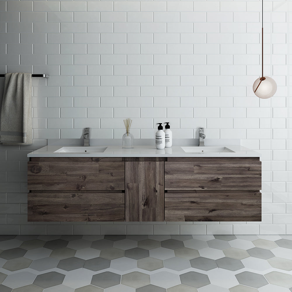 The Fresca Formosa Wall Hung Double Sink Modern Bathroom Cabinet is superbly crafted of solid Acacia wood, known for its magnificent beauty and durability. It has a warm grey finish with a hint of brown throughout, and a natural grain that will inject luxurious warmth into any space. A masterpiece of elegance and style, this wall-mounted cabinet measures 70” in width. With solid wood, soft-closing dovetail drawers and a roomy center cabinet that’s perfect for shampoo bottles, towels or other essentials, this bathroom cabinet features tons of storage. The solid pine drawers are clear coated and feature a mitered, wrap-around design that adds to the superior detailing. Cove routed pulls are carved directly into the drawers and cabinet door, keeping the design sharp and sophisticated. The Fresca Formosa Cabinet is available in multiple sizes and styles. It includes installation hardware.