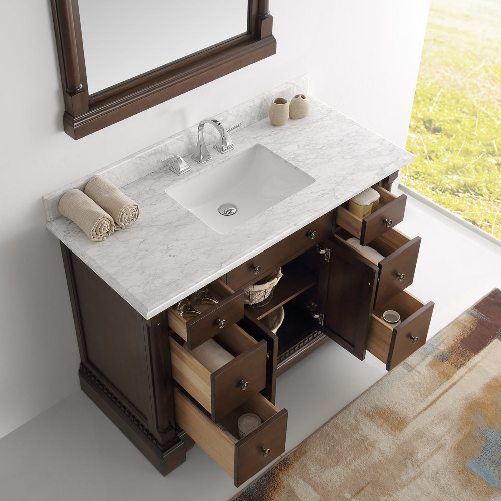 The Fresca Kingston Antique Coffee Traditional Bathroom Vanity w/ Mirror features a gorgeous Carrera Marble 1” bullnose edge countertop with 4” backsplash and white ceramic undermount sink. The vanity itself has intricately carved columns, decorative moulding and dentil cornices that elevate its beauty. With two doors and six drawers, this vanity has great storage space. Antique bronze handles add to its elegance, while a matching rectangular mirror completes the look. This lovely vanity is available in multiple sizes and makes a stylish statement in any home.