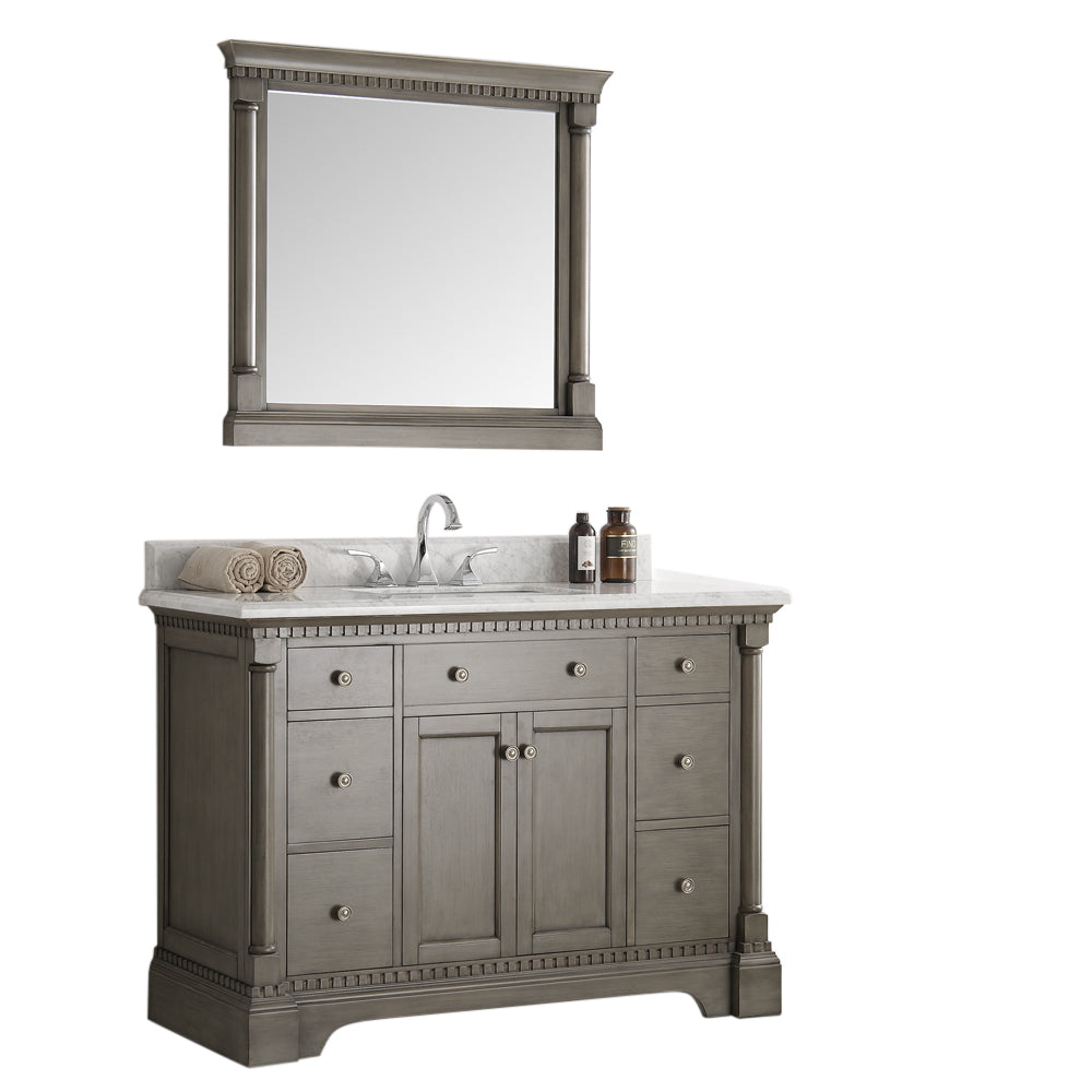 The Fresca Kingston Antique Silver Traditional Bathroom Vanity w/ Mirror features a gorgeous Carrera Marble 1” bullnose edge countertop with 4” backsplash and white ceramic undermount sink. The vanity itself has intricately carved columns, decorative moulding and dentil cornices that elevate its beauty. With two doors and six drawers, this vanity has great storage space. Satin nickel handles add to its elegance, while a matching rectangular mirror completes the look. This lovely vanity is available in multiple sizes and makes a stylish statement in any home.