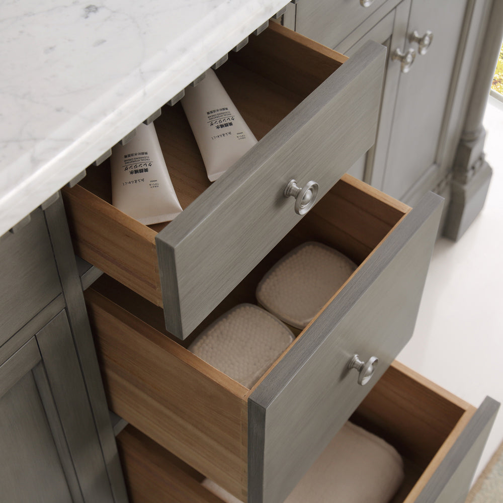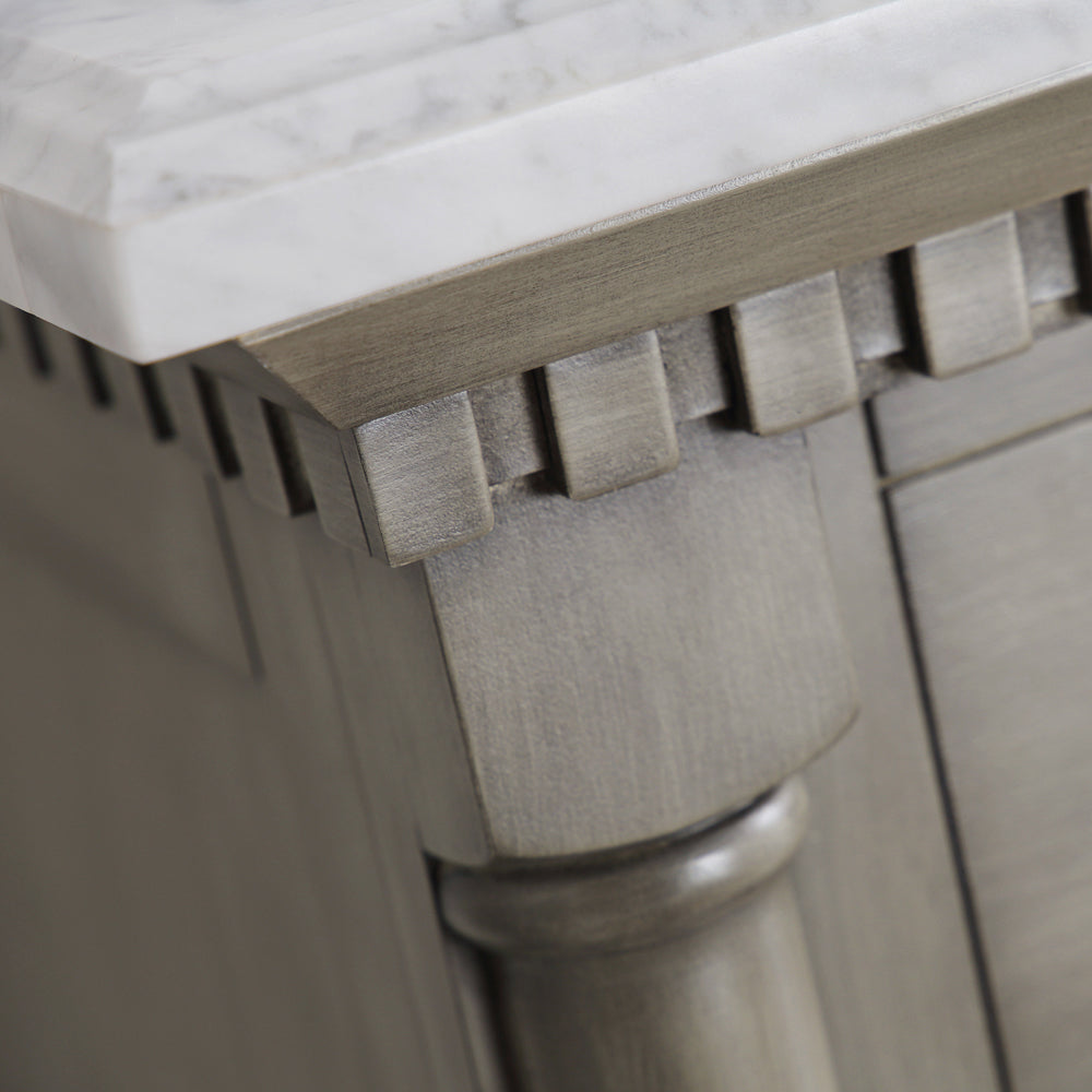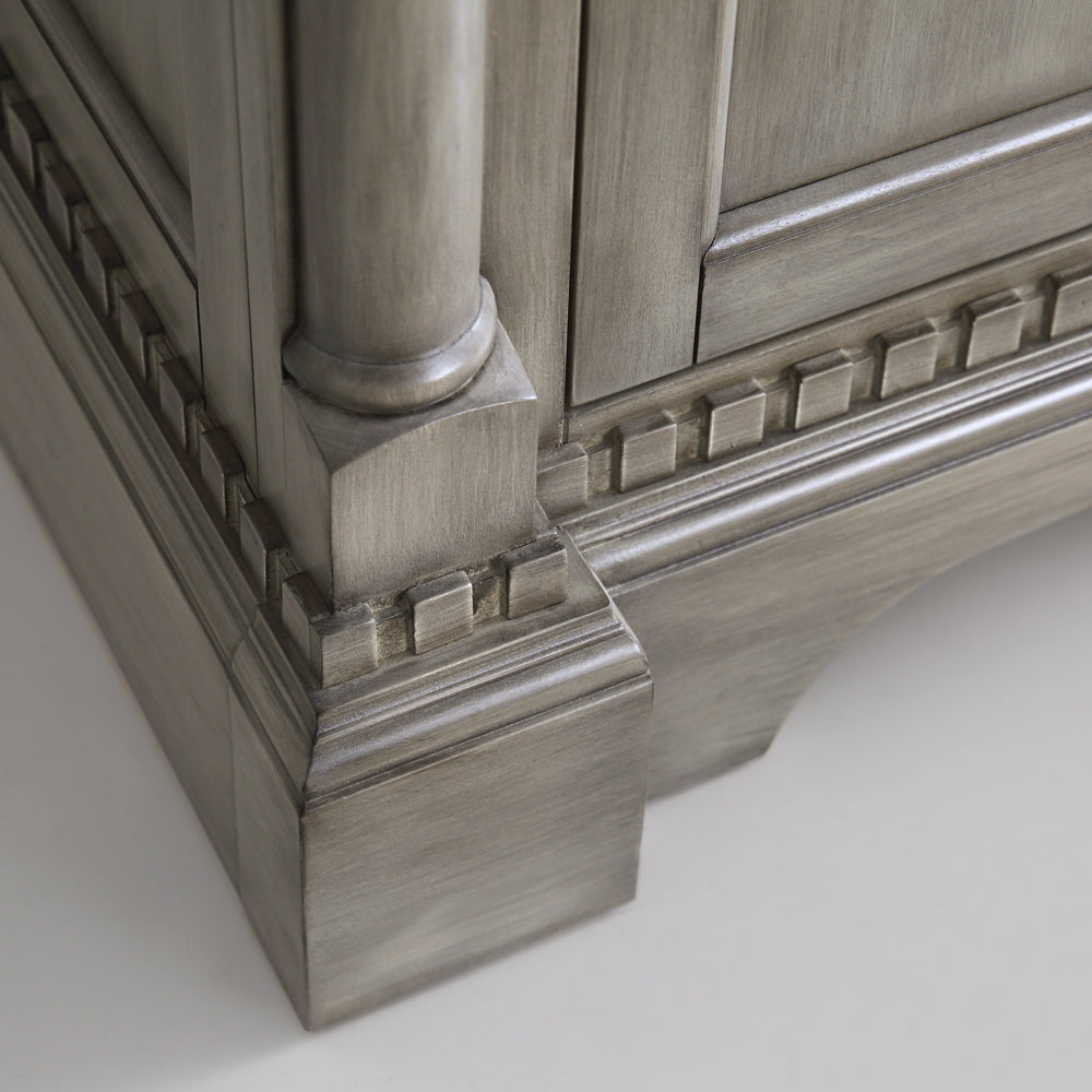 The Fresca Kingston Antique Silver Double Sink Traditional Bathroom Vanity w/ Mirror features a gorgeous Carrera Marble 1” bullnose edge countertop with 4” backsplash and two white ceramic undermount sinks. The vanity itself has intricately carved columns, decorative moulding and dentil cornices that elevate its beauty. With four doors and three drawers, this vanity has great storage space. Satin nickel handles add to its elegance, while two matching mirrors complete the look. This lovely vanity is available in multiple sizes and makes a stylish statement in any home.