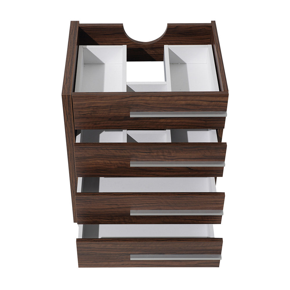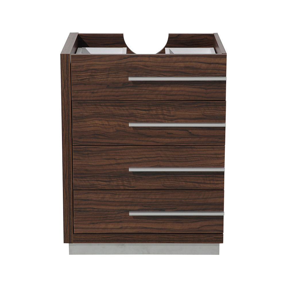 With clean lines and trendy offset brushed pulls, this stylish bathroom cabinet adds a touch of design elegance to any home. With four spacious soft closing drawers, the sleek Fresca Livello cabinet instantly updates tired décor. With a warm Walnut finish, this cabinet is a must-have for a modern or traditional bathroom. This Fresca Livello Modern Bathroom Cabinet measures 24” in width and also comes in a larger 30” width. It is available in the elegant finishes of Black, Gray Oak, Walnut, Teak and Glossy White.