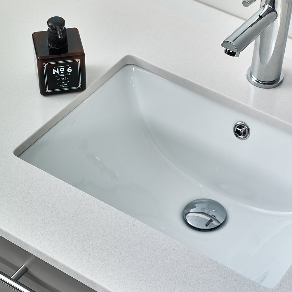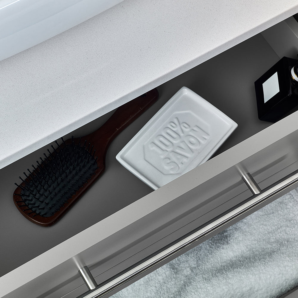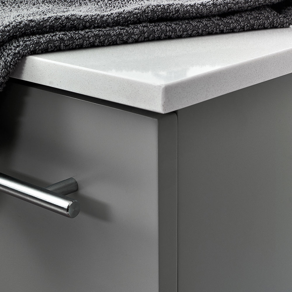 Classically simple with clean lines and a contoured undermount sink, this Fresca Lucera Wall Hung Modern Bathroom Vanity will bring out the best in any bathroom. Measuring 24” in width, this sophisticated vanity has one soft-closing drawer with a decorative beveled drawer plate design and slim brushed metal handle. This modern vanity has a chic painted Gray finish. Gracing the top of the vanity is a striking quartz stone countertop with backsplash and a white ceramic undermount sink. The sink is equipped with an integrated overflow and comes with a single hole faucet, p-trap, pop-up drain and installation hardware. A matching frameless Fresca 20” Bathroom Medicine Cabinet is also included.