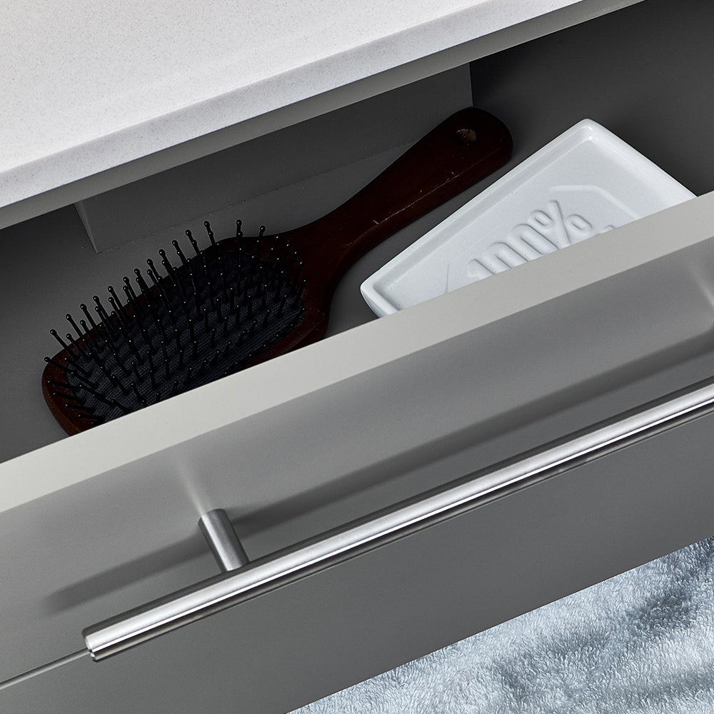 Classically simple with clean lines and a beautiful vessel sink, this Fresca Lucera Wall Hung Modern Bathroom Vanity will bring out the best in any bathroom. Measuring 24” in width, this sophisticated vanity has two soft-closing drawers with a decorative beveled drawer plate design and slim brushed metal handles. This modern vanity has a chic painted Gray finish. Gracing the top of the vanity is a striking quartz stone countertop with a white vessel sink. The sink is equipped with an integrated overflow and comes with a single hole vessel faucet, p-trap, pop-up drain and installation hardware. A matching frameless Fresca 20” Bathroom Medicine Cabinet is also included.