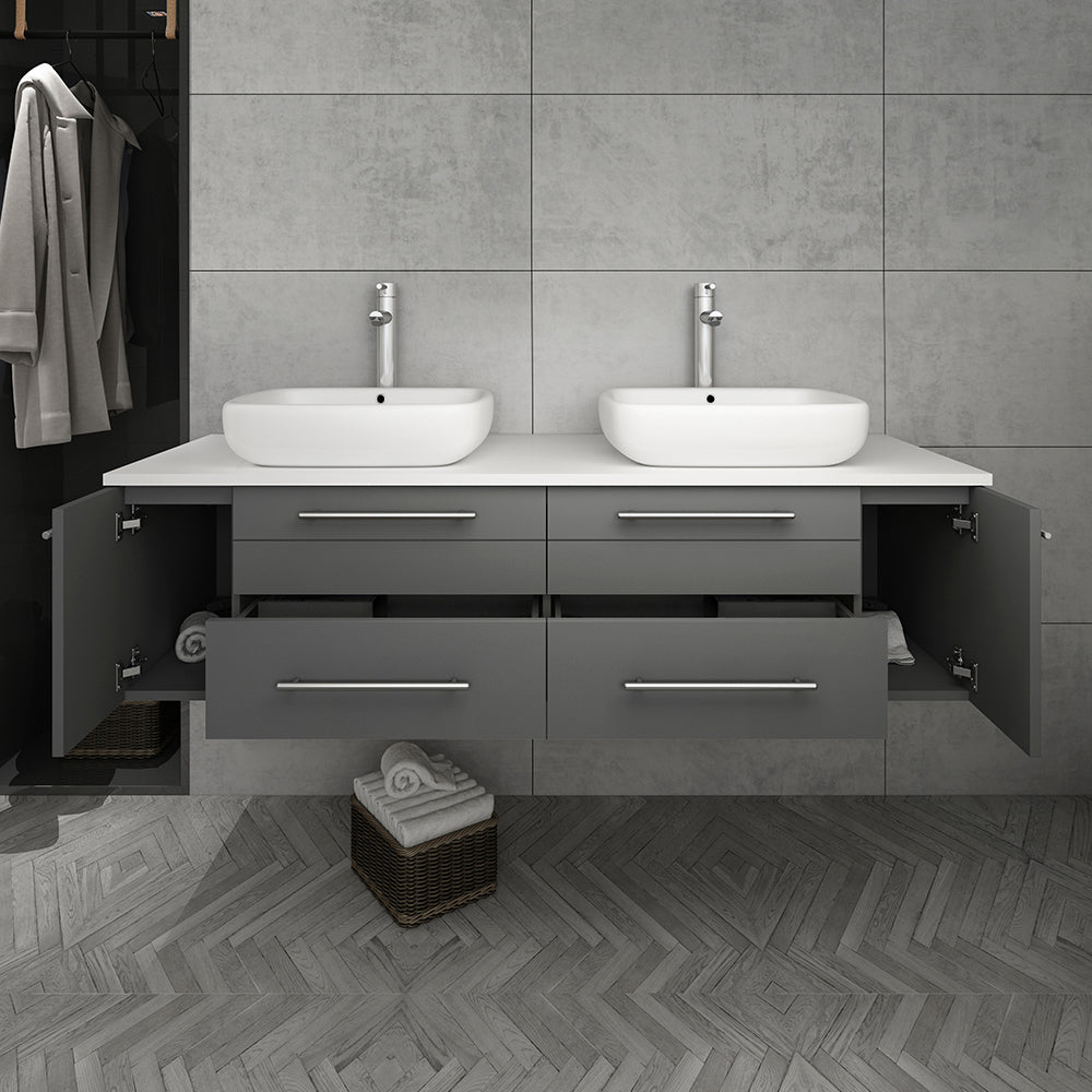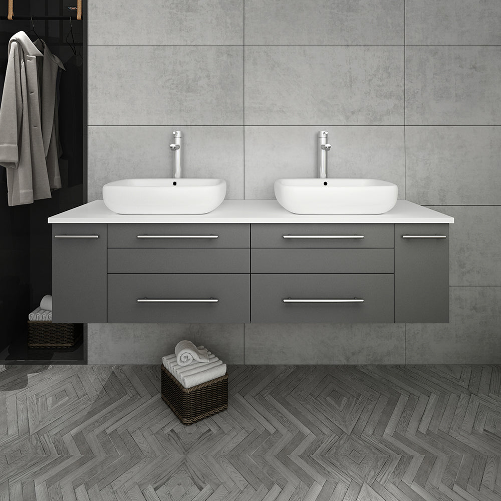 Fresca Lucera 60" Gray Wall Hung Modern Bathroom Cabinet w/ Top & Double Vessel Sinks
