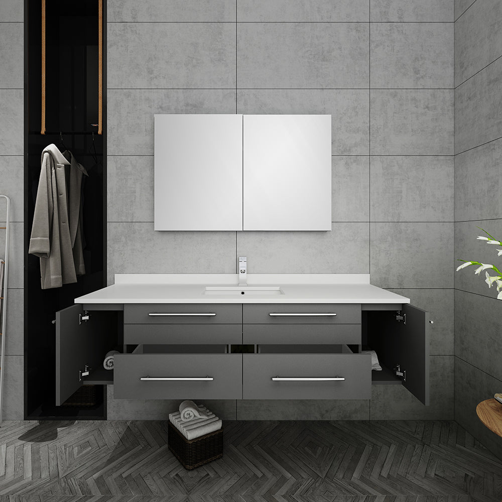 Classically simple with clean lines and a contoured undermount sink, this Fresca Lucera Wall Hung Modern Bathroom Vanity will bring out the best in any bathroom. Measuring 60” in width, this sophisticated vanity has a well constructed solid wood frame with two roomy storage compartments for holding bathroom essentials and two spacious drawers with a decorative beveled drawer plate design. The doors and drawers are soft-closing and feature slim brushed metal handles. This modern vanity has a chic painted Gray finish. Gracing the top of the vanity is a striking quartz stone countertop with backsplash and a white ceramic undermount sink. The sink is equipped with an integrated overflow and comes with a single hole faucet, p-trap, pop-up drain and installation hardware. This vanity comes with a Fresca 40” Bathroom Medicine Cabinet. The medicine cabinet features mirrors on the front, along the edges and also on the interior. Two tempered glass shelves provide great storage space.