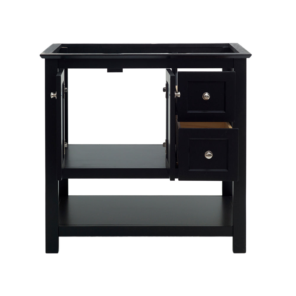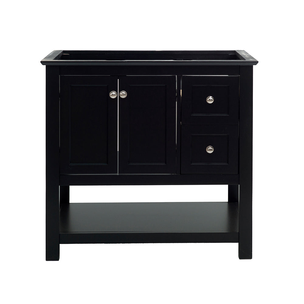 Add instant style and classic charm to your bathroom with the clean, timeless design of our Fresca Manchester 36” Traditional Bathroom Cabinet. This beautifully constructed cabinet features panelled solid wood doors with soft close hinges to ensure they close silently and effortlessly every time. There are two soft closing drawers that offer ample space for your bathroom essentials and an open bottom shelf for storing towels and additional bath supplies. This traditional cabinet has an elegant, painted Black finish and brushed nickel handles. It includes installation hardware and is available in several sizes and finishes to meet your decorating needs.
