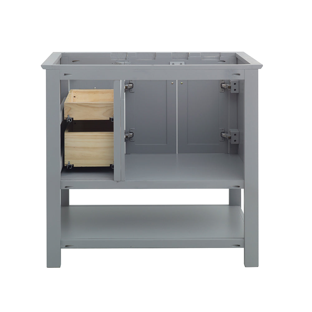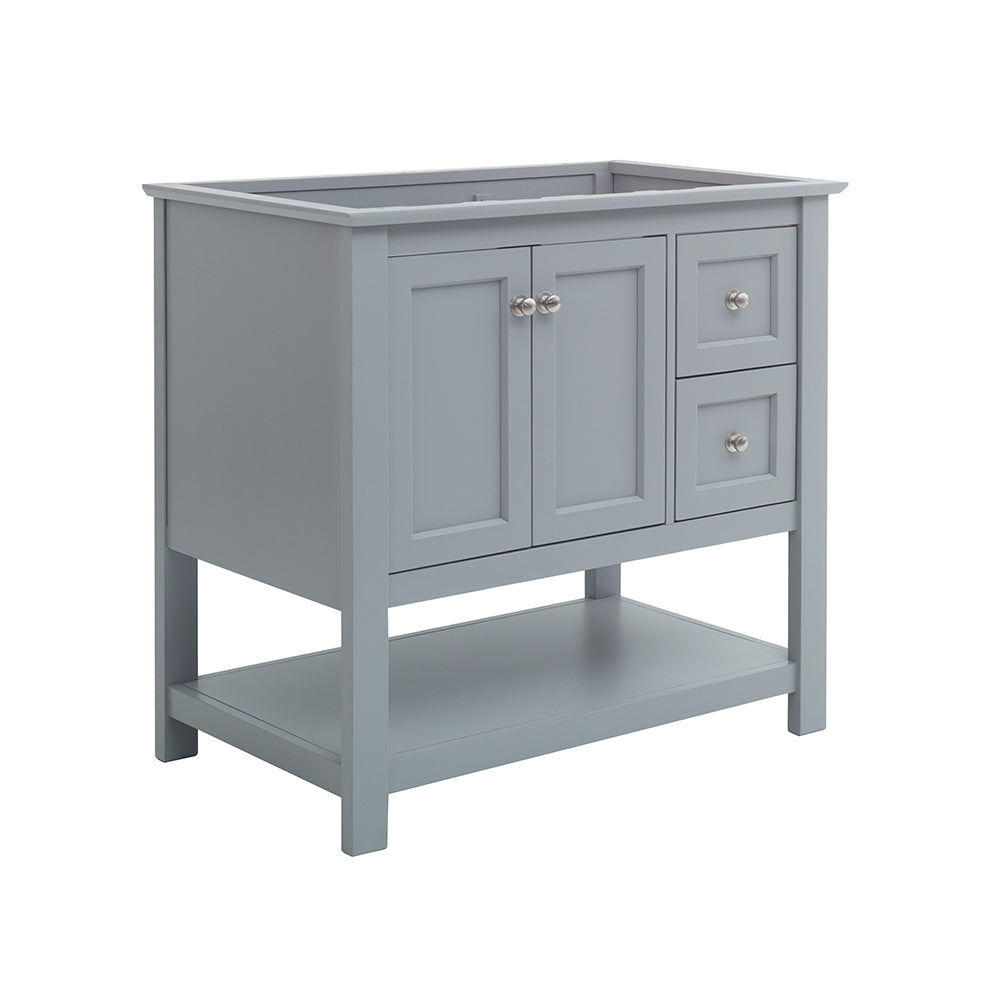 Add instant style and classic charm to your bathroom with the clean, timeless design of our Fresca Manchester 36” Traditional Bathroom Cabinet. This beautifully constructed cabinet features panelled solid wood doors with soft close hinges to ensure they close silently and effortlessly every time. There are two soft closing drawers that offer ample space for your bathroom essentials and an open bottom shelf for storing towels and additional bath supplies. This traditional cabinet has an elegant, painted Gray finish and brushed nickel handles. It includes installation hardware and is available in several sizes and finishes to meet your decorating needs.