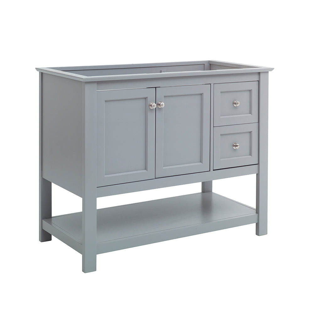 Add instant style and classic charm to your bathroom with the clean, timeless design of our Fresca Manchester 42” Traditional Bathroom Cabinet. This beautifully constructed cabinet features panelled solid wood doors with soft close hinges to ensure they close silently and effortlessly every time. There are two soft closing drawers that offer ample space for your bathroom essentials and an open bottom shelf for storing towels and additional bath supplies. This traditional cabinet has an elegant, painted Gray finish and brushed nickel handles. It includes installation hardware and is available in several sizes and finishes to meet your decorating needs.