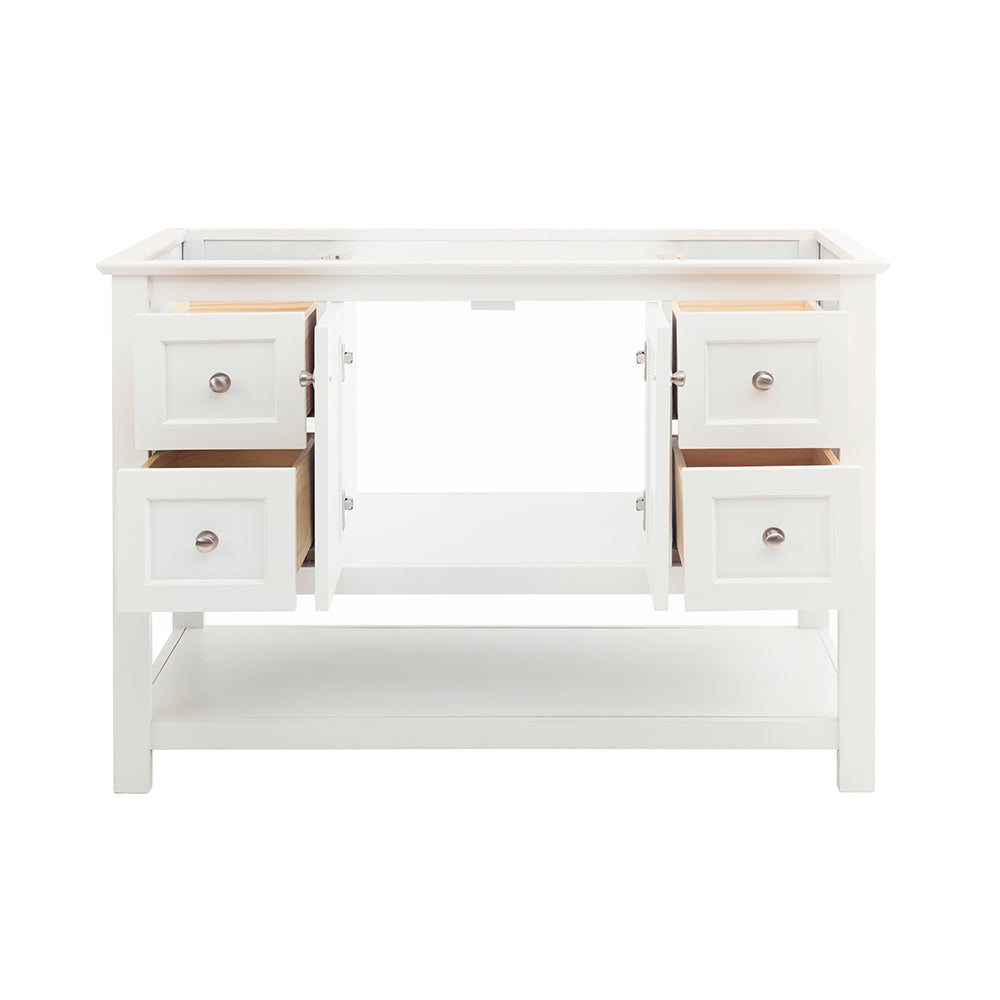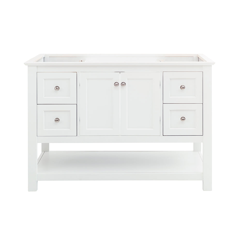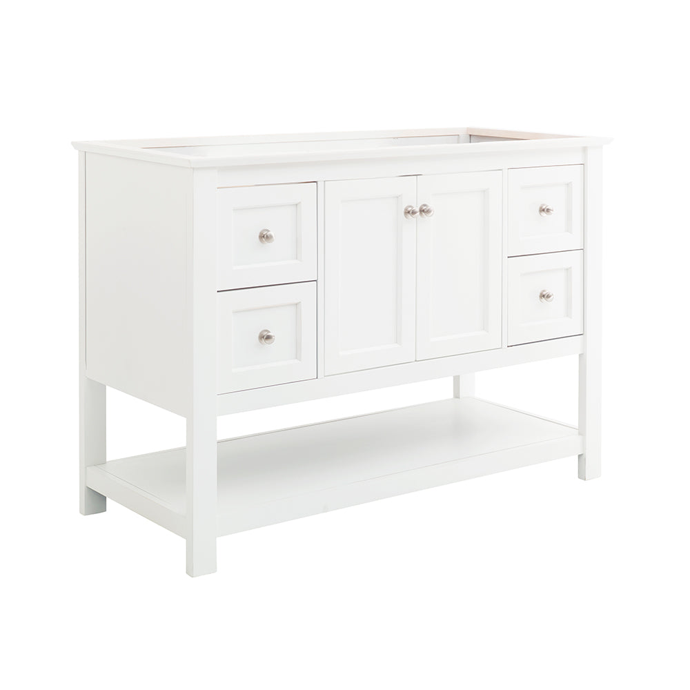 Brighten your bathroom with the clean, timeless design of our Fresca Manchester 48” Traditional Bathroom Cabinet. This beautifully constructed cabinet features panelled solid wood doors with soft close hinges to ensure they close silently and effortlessly every time. There are four soft closing drawers that offer ample space for your bathroom essentials and an open bottom shelf for storing towels and additional bath supplies. This traditional cabinet has an elegant, painted White finish and brushed nickel handles. It includes installation hardware and is available in several sizes and finishes to meet your decorating needs.