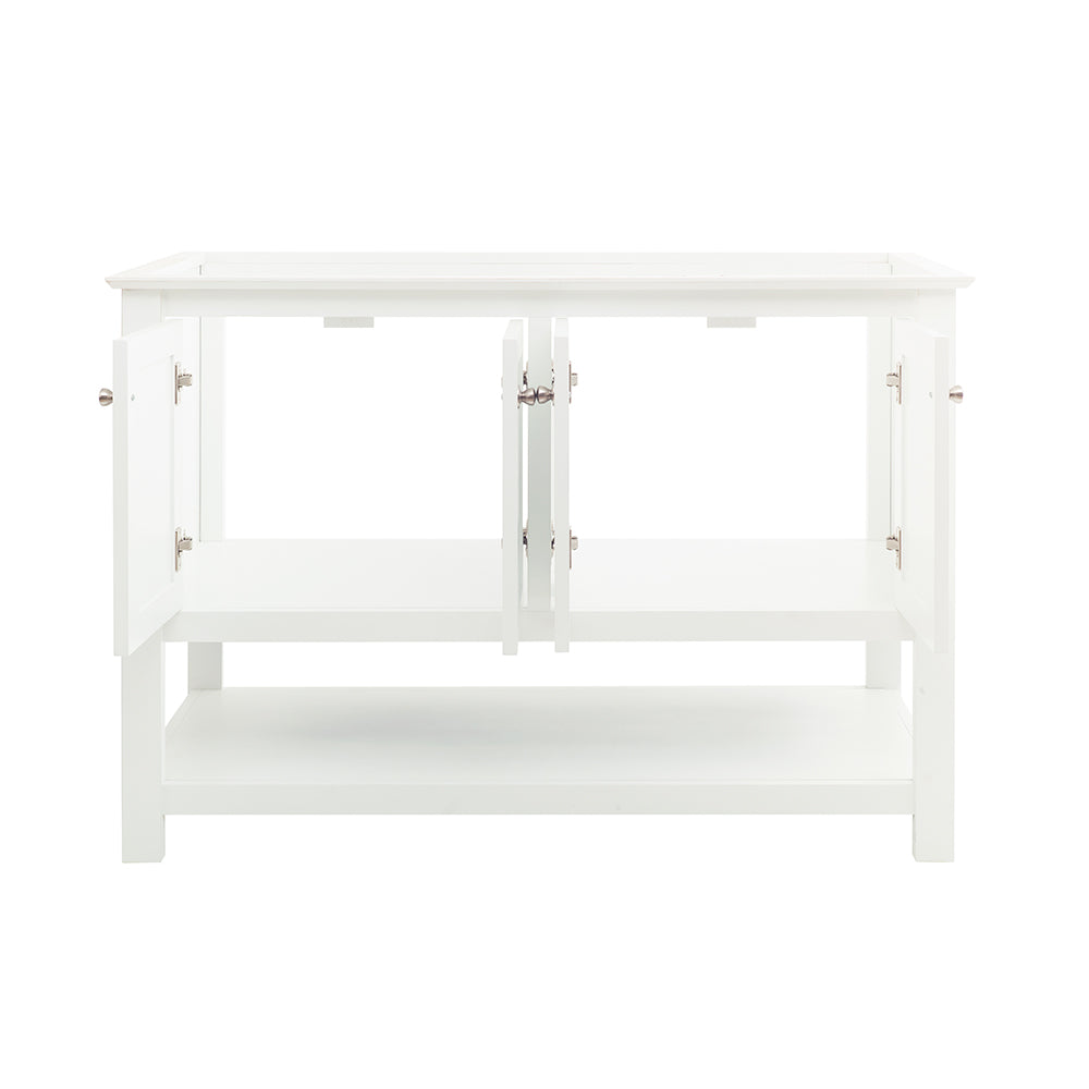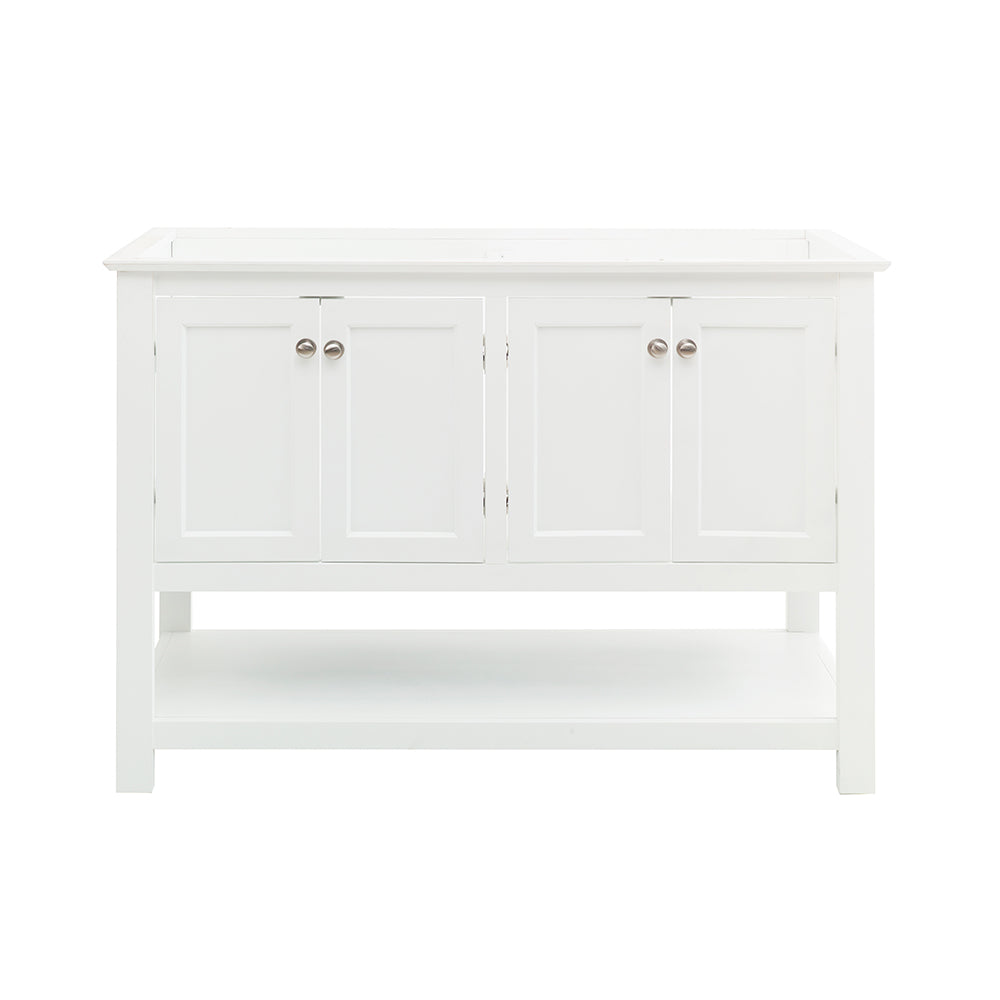 Brighten your bathroom with the clean, timeless design of our Fresca Manchester 48” Traditional Double Sink Bathroom Cabinet. This beautifully constructed cabinet features solid wood doors that open to reveal two roomy compartments for organizing products of varying sizes and keeping all of your bathroom essentials within reach. Soft close hinges ensure the doors close silently and effortlessly every time. Open bottom shelves are ideal for storing towels and additional bath supplies. Designed to complement any décor scheme, this traditional cabinet has an elegant, painted White finish and brushed nickel handles. It includes installation hardware and is available in several sizes and finishes to meet your decorating needs.