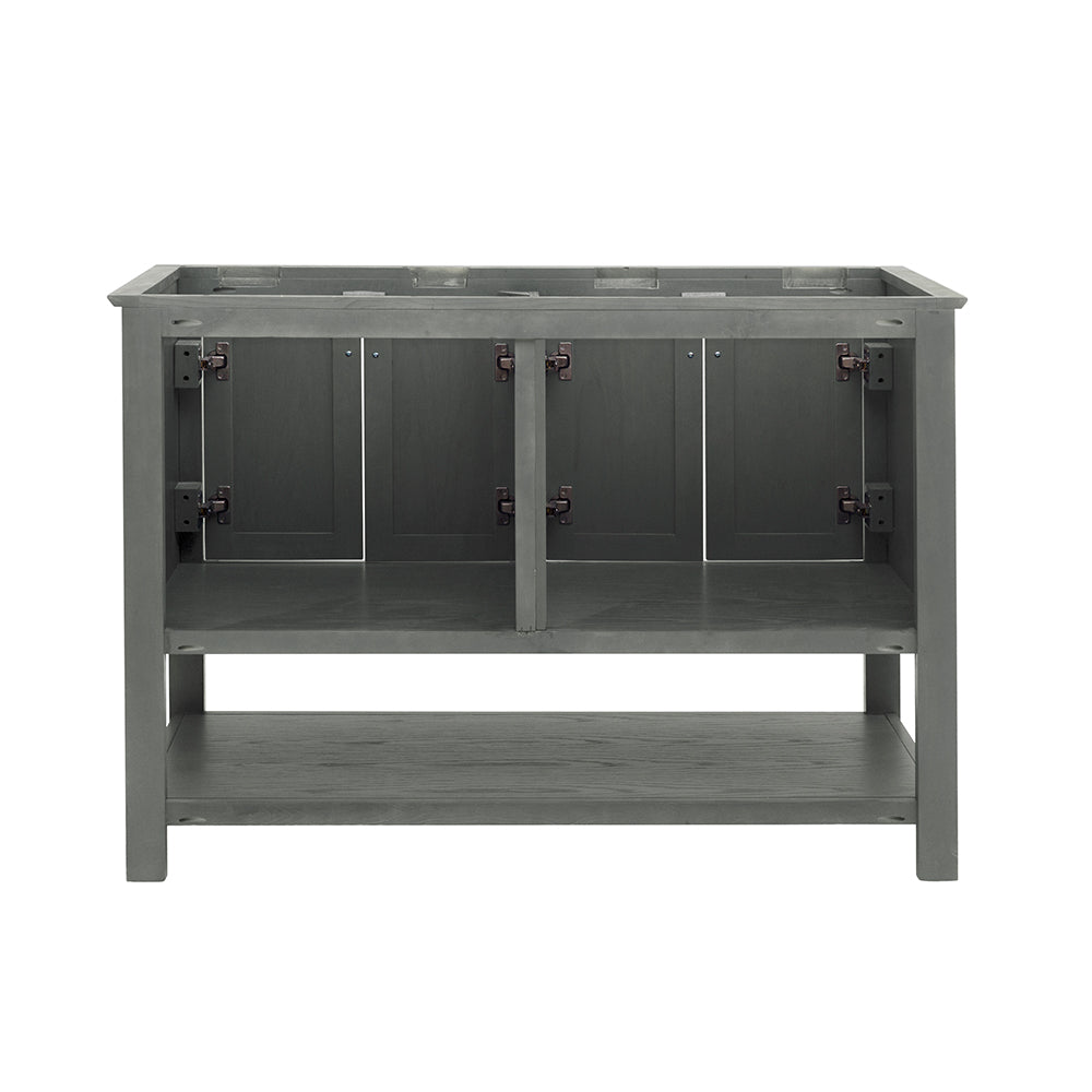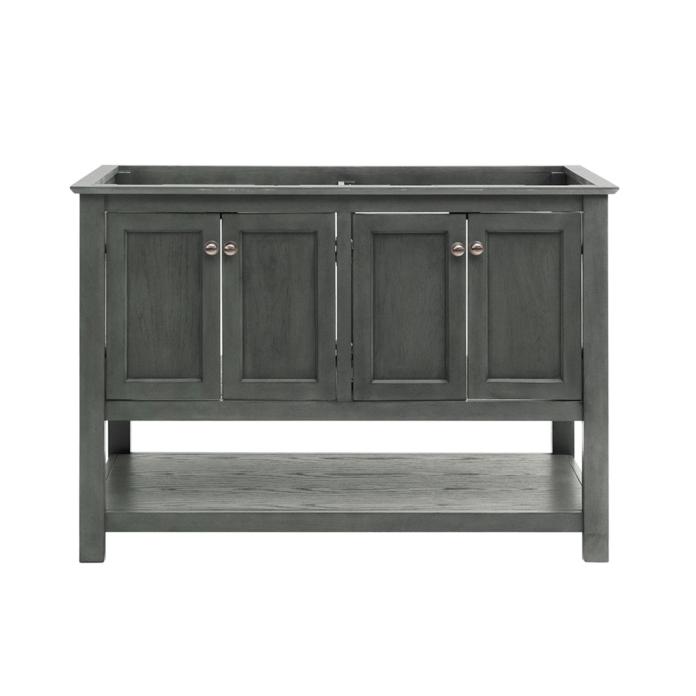 Add a sophisticated touch to your bathroom with the clean, timeless design of our Fresca Manchester Regal 48” Traditional Double Sink Bathroom Cabinet. This beautifully constructed cabinet features solid wood doors that open to reveal two roomy compartments for organizing products of varying sizes and keeping all of your bathroom essentials within reach. Soft close hinges ensure the doors close silently and effortlessly every time. Open bottom shelves are ideal for storing towels and additional bath supplies. Designed to elevate any décor scheme, this traditional cabinet has an elegant, Gray Wood Veneer finish and brushed nickel handles. It includes installation hardware and is available in several sizes and finishes to meet your decorating needs.