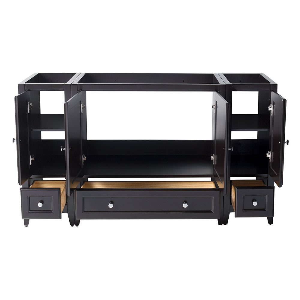 Whether you prefer a modern look or a more traditional style, the Fresca Oxford Traditional Bathroom Cabinets are a great starting point when updating your bathroom. They would blend beautifully with any decor. These shaker style wood cabinets have a rich Espresso finish. Designed to be used with a two sink vanity top, this stylish cabinet combination offers ample storage space for all your bathroom necessities. It features two large open storage compartments on each side, and a smaller, shelved cabinet in the middle of the unit. To give this piece a unique touch, handy dovetail drawers are positioned along the base of the cabinets, providing additional space. These lovely cabinets feature soft-close mechanism and polished chrome pulls. The Fresca Oxford Espresso Traditional Double Sink Bathroom Cabinets measure 60" in width and are also offered with an Antique White or Mahogany finish, in various sizes and configurations.