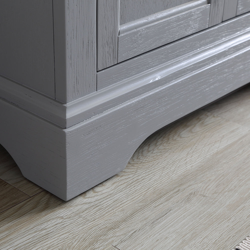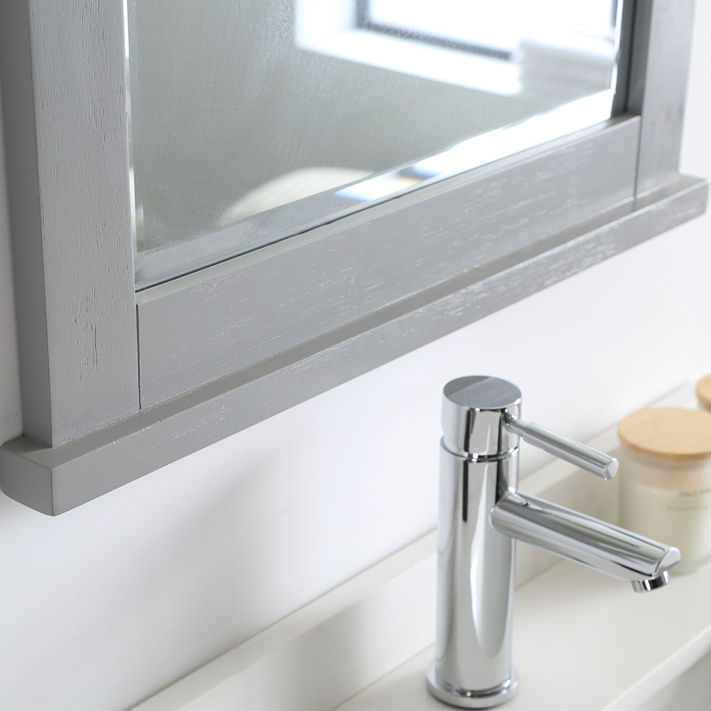 With its sophisticated textured Gray finish, the Windsor Traditional Freestanding Bathroom Vanity with Mirror features top-to-bottom details that elevate its beauty; Cavetto crown molding graces the top, while the toe kick with elegant stacked base molding adds the perfect finishing touch. The shaker-style flat panel doors open to reveal a handy shelf and concealed drawer that’s ideal for storing hand towels and miscellaneous essentials. The dovetail drawer is solid pine with a clear coat finish. Both the soft-close drawer and doors feature distinctive brushed nickel pulls. The cabinet comes fully assembled and includes installation hardware. Gracing the top of the cabinet is a stunning quartz stone countertop and ceramic undermount sink. The white sink with overflow has a smooth, contoured design, while the quartz stone countertop has clean, square edges. The countertop has been pre-drilled to accommodate a single hole faucet (included). P-trap, pop-up drain and installation hardware are also included. This vanity also comes with a Windsor Traditional 24” Mirror. The shaker-style mirror has a streamlined silhouette with detailed molding on the top and bottom. This vanity is available in various sizes and finishes to enhance any bathroom setting.