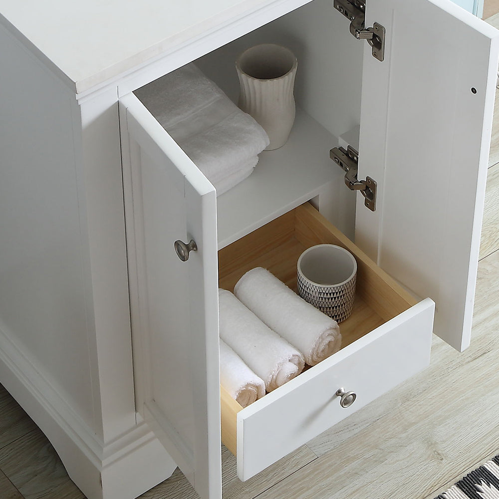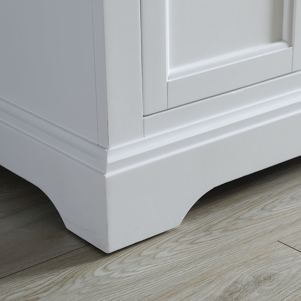 With its sophisticated textured White finish, the Windsor Traditional Freestanding Bathroom Vanity with Mirror features top-to-bottom details that elevate its beauty; Cavetto crown molding graces the top, while the toe kick with elegant stacked base molding adds the perfect finishing touch. The shaker-style flat panel doors open to reveal a handy shelf and concealed drawer that’s ideal for storing hand towels and miscellaneous essentials. The dovetail drawer is solid pine with a clear coat finish. Both the soft-close drawer and doors feature distinctive brushed nickel pulls. To make installation a breeze, the cabinet comes fully assembled and includes installation hardware. Gracing the top of the cabinet is a stunning quartz stone countertop and ceramic undermount sink. The white sink with overflow has a smooth, contoured design, while the quartz stone countertop has clean, square edges. The countertop has been pre-drilled to accommodate a single hole faucet (included). To complete the look, this vanity also comes with a Windsor Traditional Mirror. The shaker-style mirror has a streamlined silhouette with detailed molding on the top and bottom. This vanity is available in various sizes and finishes to enhance any bathroom setting.