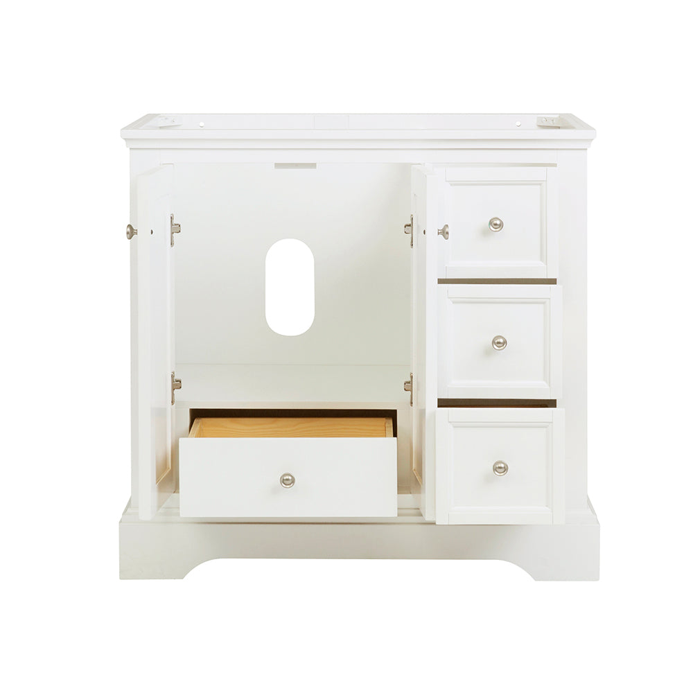 With its sophisticated textured White finish, the Windsor Traditional Freestanding Bathroom Cabinet features top-to-bottom details that elevate its beauty; Cavetto crown molding graces the top, while the toe kick with elegant stacked base molding adds the perfect finishing touch. The shaker-style flat panel doors open to reveal a handy shelf and concealed drawer that’s ideal for keeping wash cloths or hand towels within reach. Three spacious, soft closing drawers provide ample storage space for all of your bathroom essentials. The dovetail drawers are solid pine with a clear coat finish. The soft-close drawers and doors all feature distinctive brushed nickel pulls. This lovely cabinet will enhance any décor and is available in multiple sizes and finishes. It includes installation hardware.