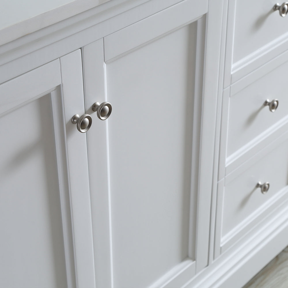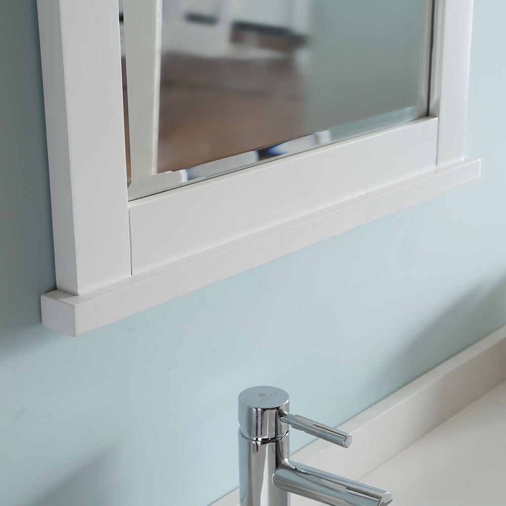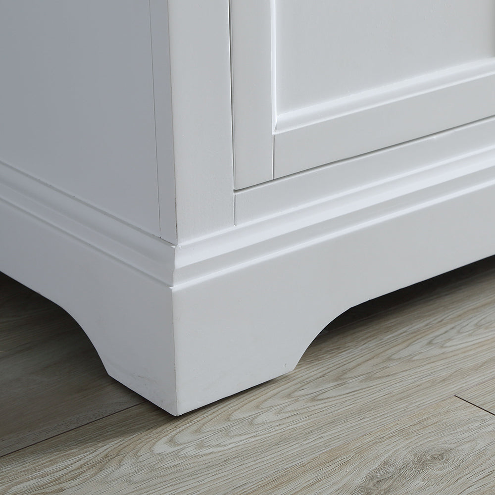 With its sophisticated textured White finish, the Windsor Traditional Freestanding Bathroom Vanity with Mirror features top-to-bottom details that elevate its beauty; Cavetto crown molding graces the top, while the toe kick with elegant stacked base molding adds the perfect finishing touch. The shaker-style flat panel doors open to reveal two roomy compartments for organizing products of varying sizes, and concealed drawers that are ideal for keeping wash cloths or hand towels within reach. Spacious, soft closing drawers down the center provide great storage for all of your bathroom essentials. The dovetail drawers are solid pine with a clear coat finish. The soft-close drawers and doors all feature distinctive brushed nickel pulls. The countertop has been pre-drilled to accommodate two single hole faucets (included). To complete the look, this vanity also comes with two Windsor Traditional 24” Mirrors. The shaker-style mirrors have a streamlined silhouette with detailed molding on the top and bottom. This vanity is available in various sizes and finishes to enhance any bathroom setting.