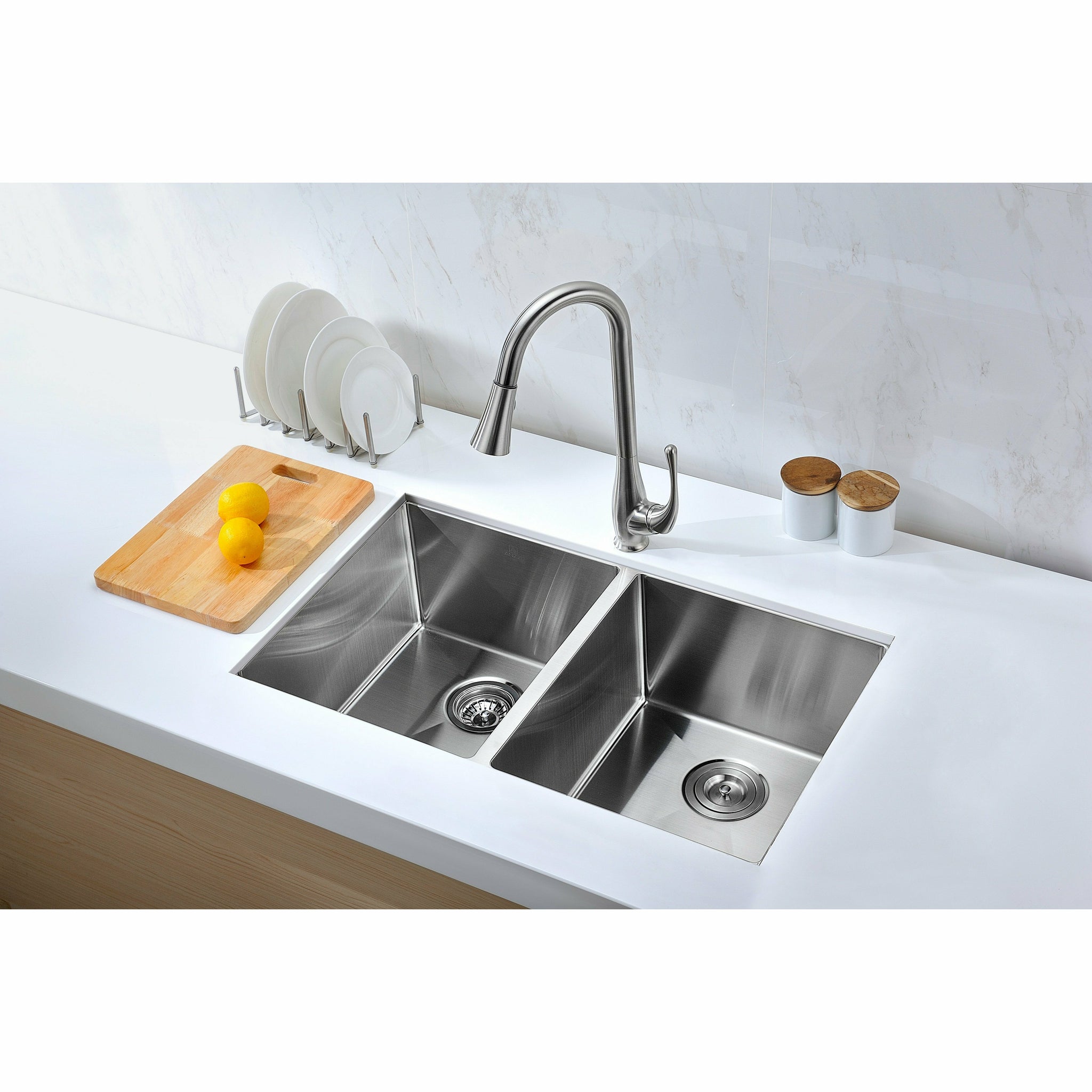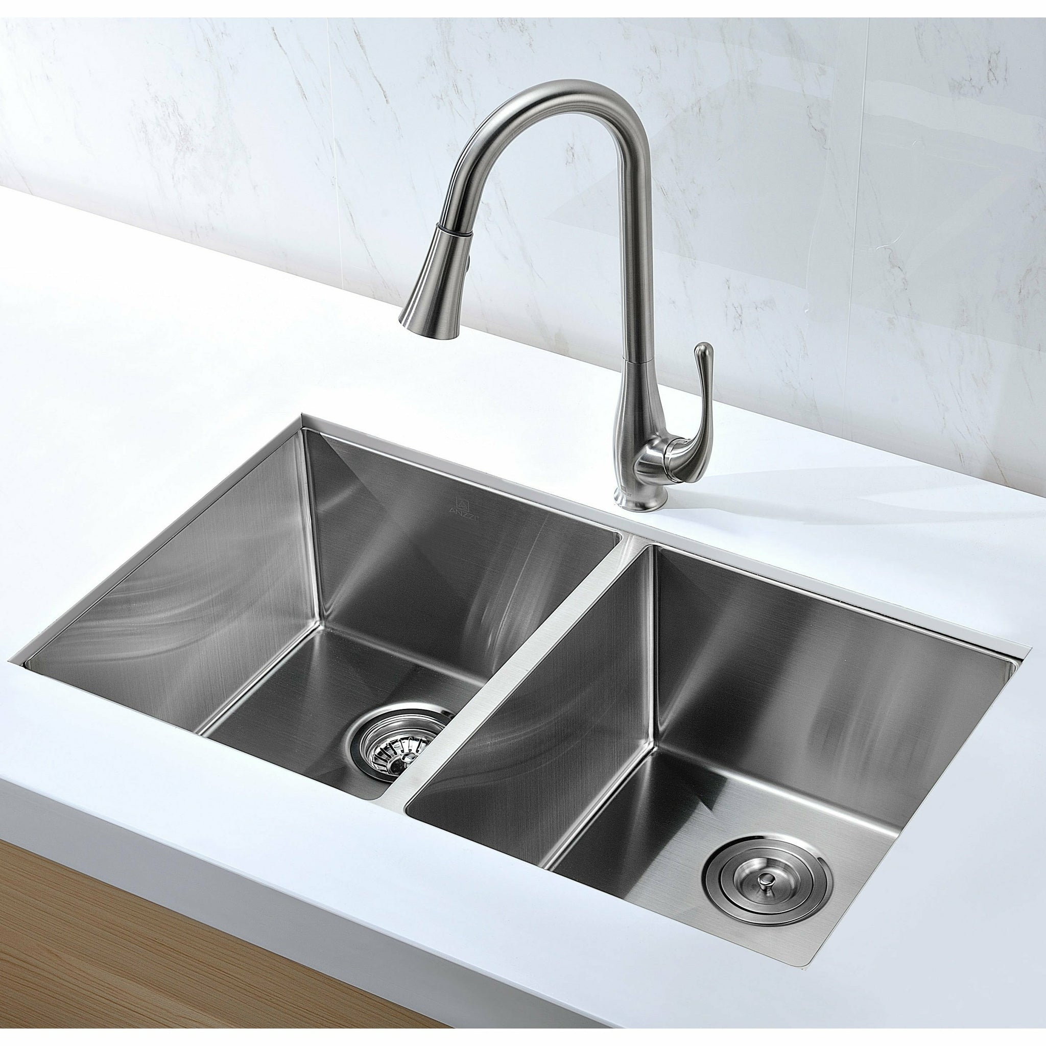 Vanguard Undermount Stainless Steel 32 in. 0-Hole 50/50 Double Bowl Kitchen Sink in Brushed Satin