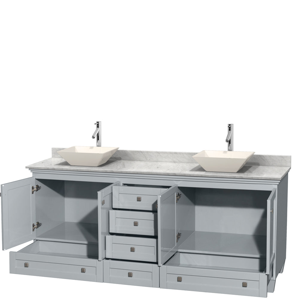Wyndham Acclaim 80 Inch Double Bathroom Vanity in Oyster Gray, White Carrara Marble Countertop, Pyra Bone Porcelain Sinks, and No Mirrors