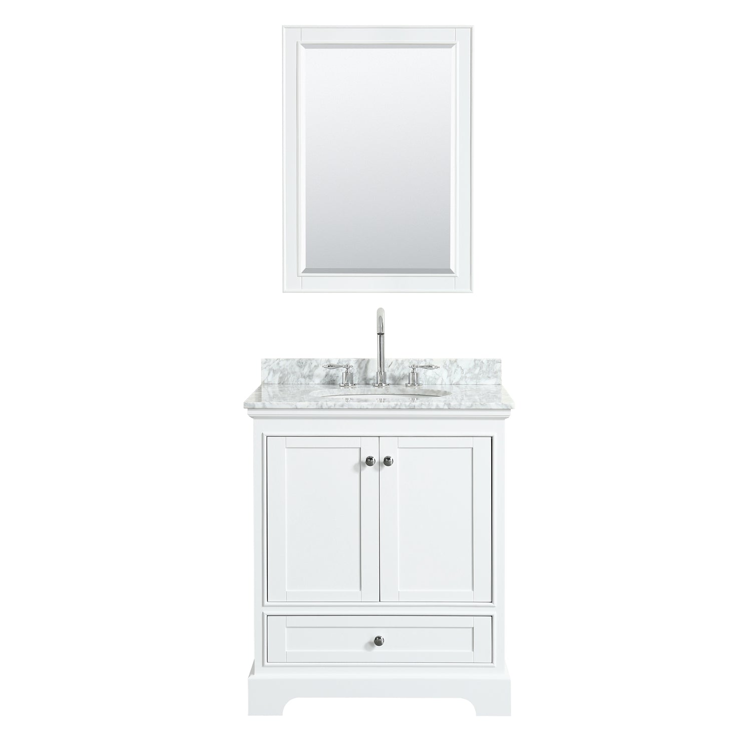 Wyndham Deborah 30 Inch Single Bathroom Vanity in White, White Carrara Marble Countertop, Undermount Oval Sink, and 24 Inch Mirror