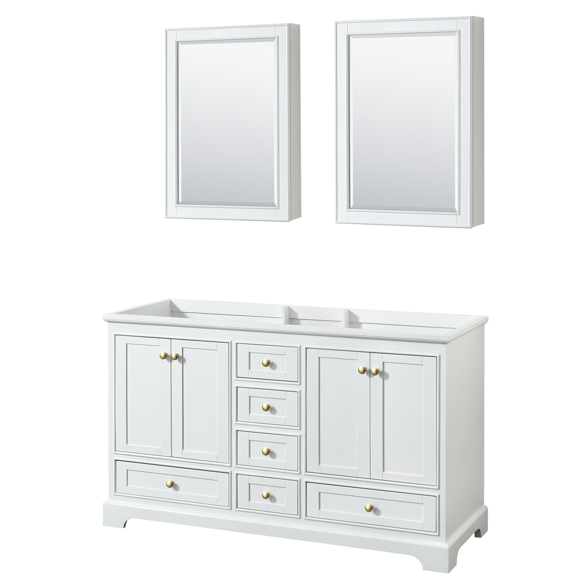 Wyndham Deborah 60 Inch Double Bathroom Vanity in White, No Countertop, No Sinks, Brushed Gold Trim, Medicine Cabinets