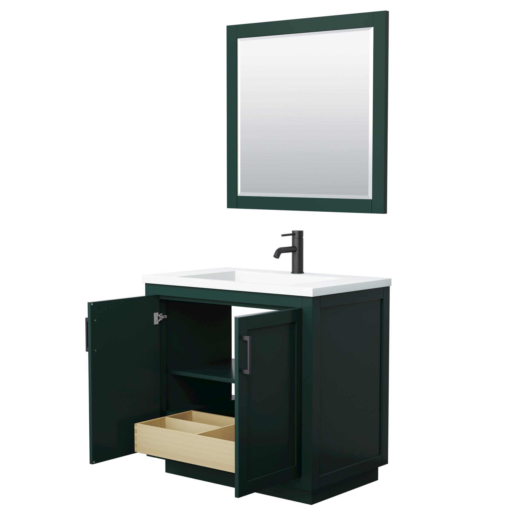 Wyndham Miranda 36 Inch Single Bathroom Vanity in Green, 1.25 Inch Thick Matte White Solid Surface Countertop, Integrated Sink, Matte Black Trim, 34 Inch Mirror