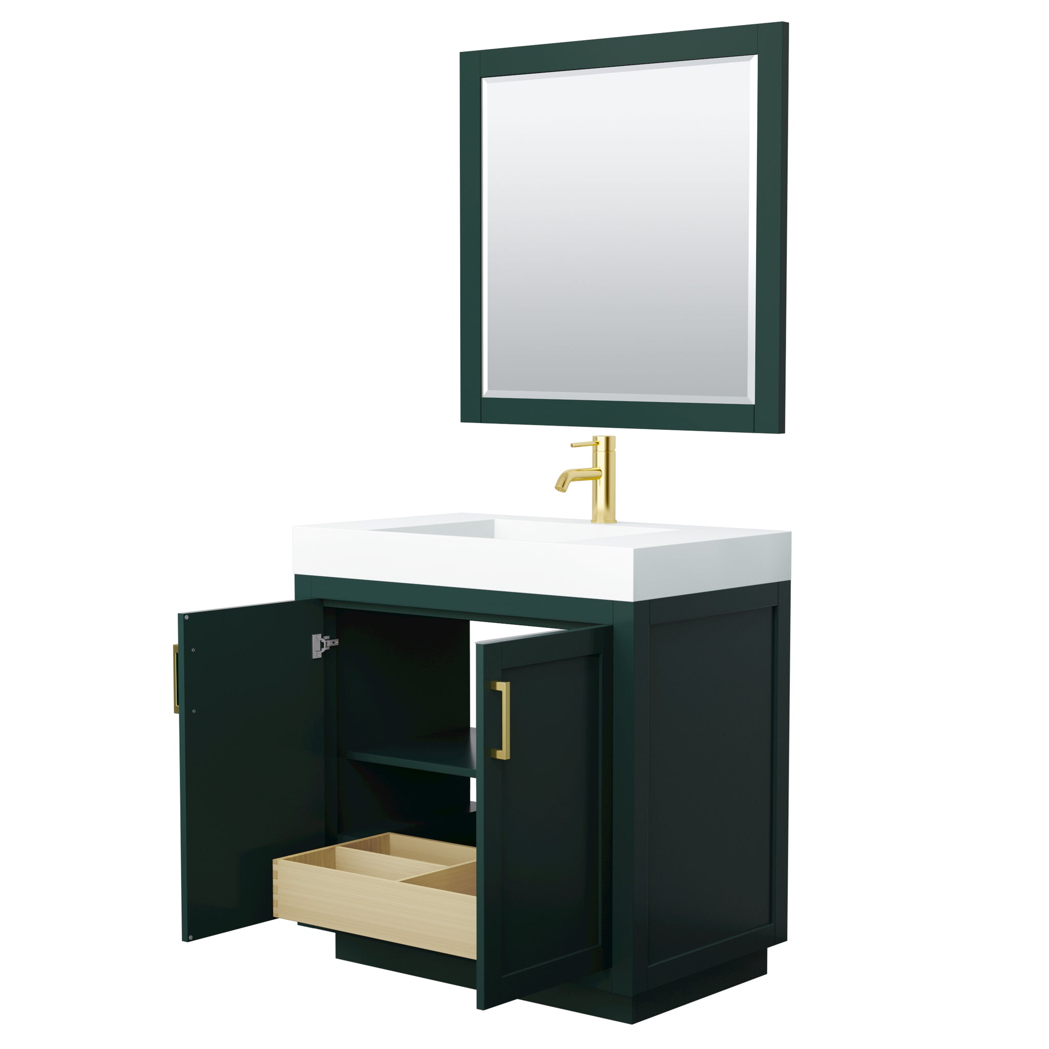 Wyndham Miranda 36 Inch Single Bathroom Vanity in Green, 4 Inch Thick Matte White Solid Surface Countertop, Integrated Sink, Brushed Gold Trim, 34 Inch Mirror