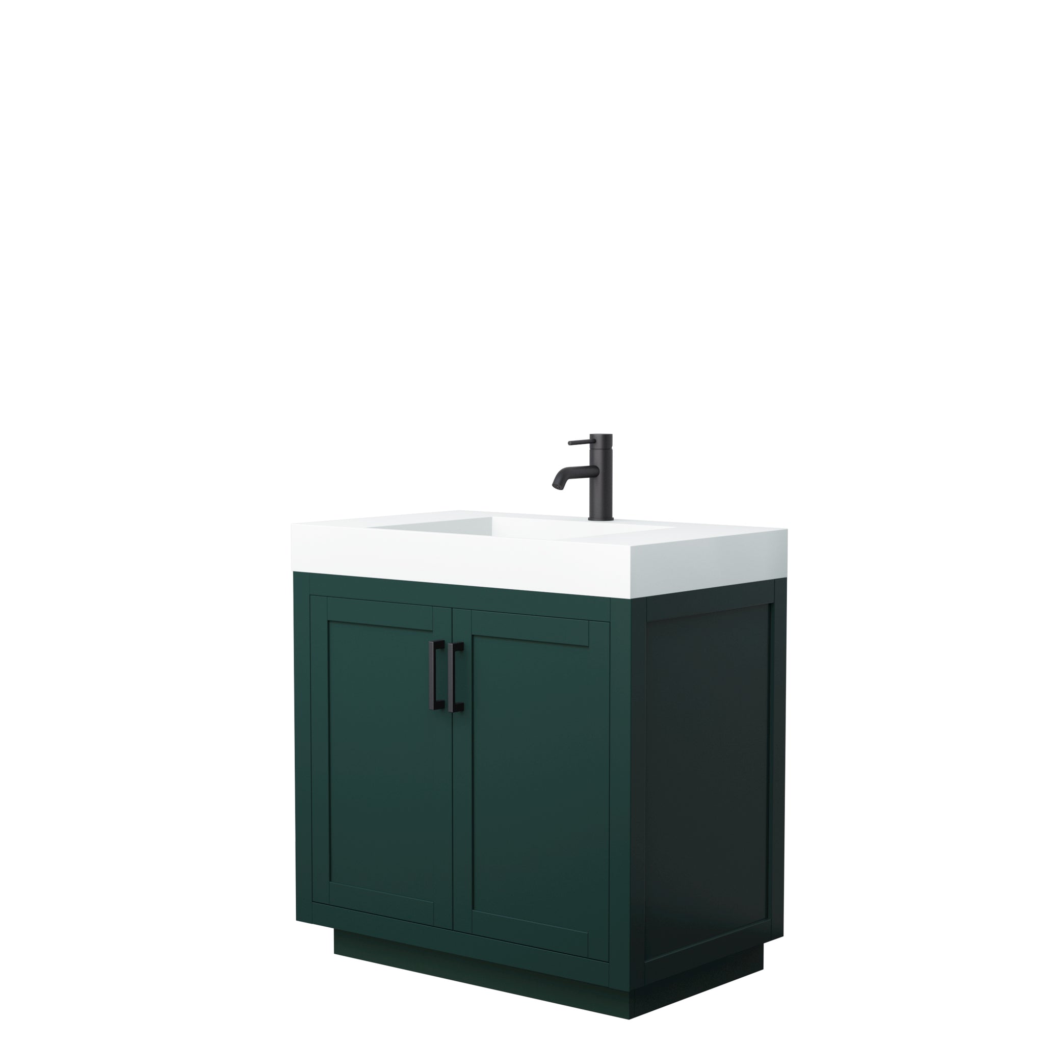 Wyndham Miranda 36 Inch Single Bathroom Vanity in Green, 4 Inch Thick Matte White Solid Surface Countertop, Integrated Sink, Matte Black Trim