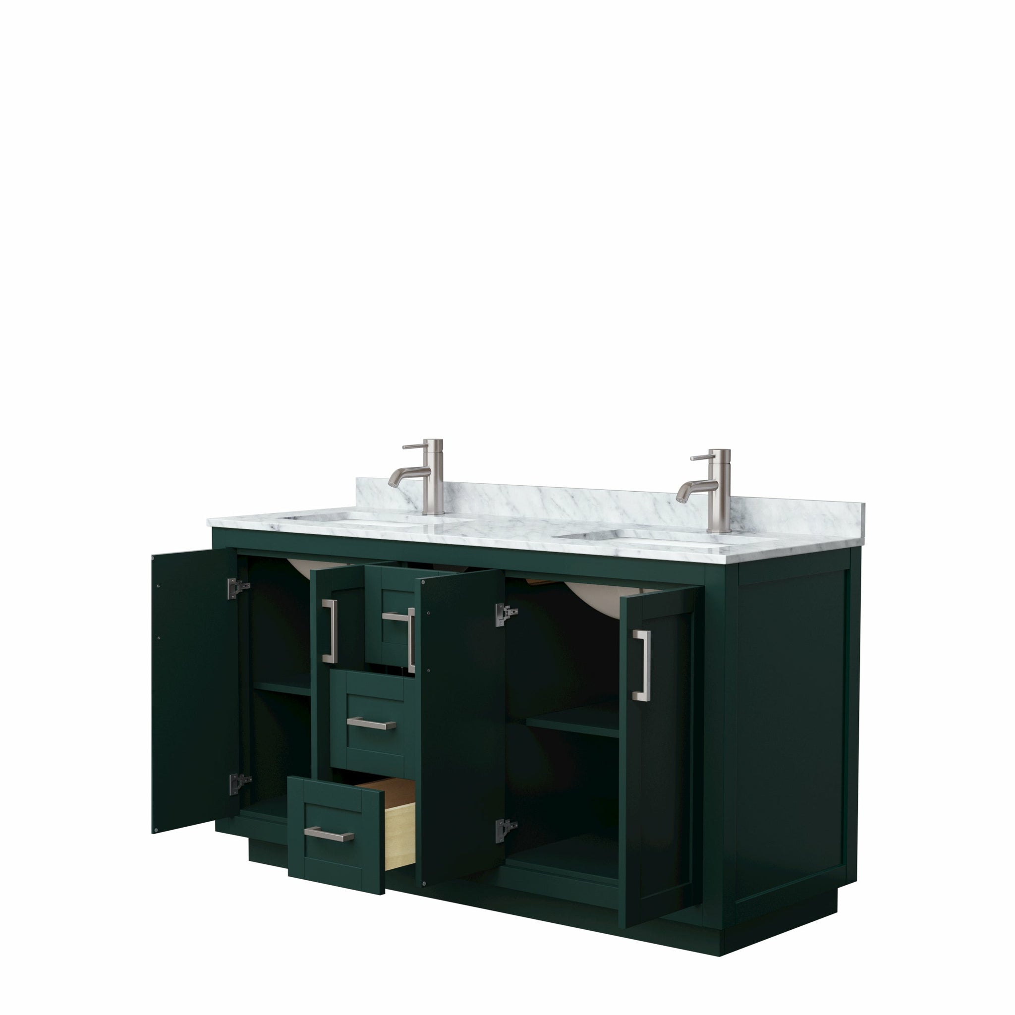 Wyndham Miranda 60 Inch Double Bathroom Vanity in Green, White Carrara Marble Countertop, Undermount Square Sinks, Brushed Nickel Trim