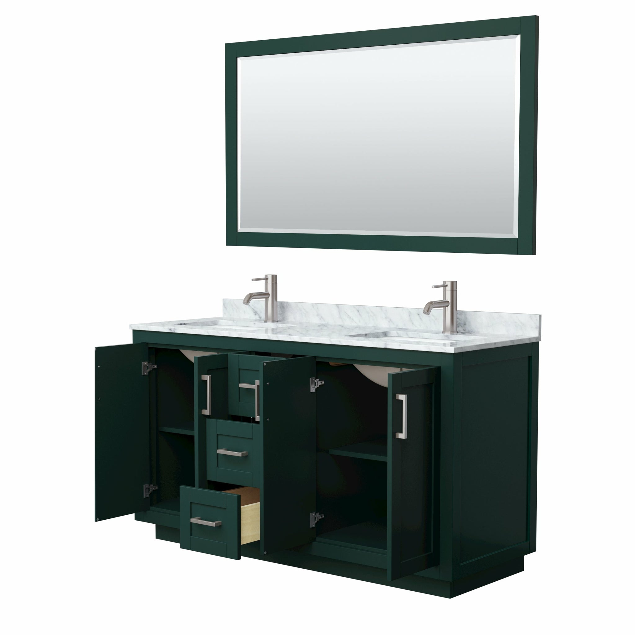 Wyndham Miranda 60 Inch Double Bathroom Vanity in Green, White Carrara Marble Countertop, Undermount Square Sinks, Brushed Nickel Trim, 58 Inch Mirror