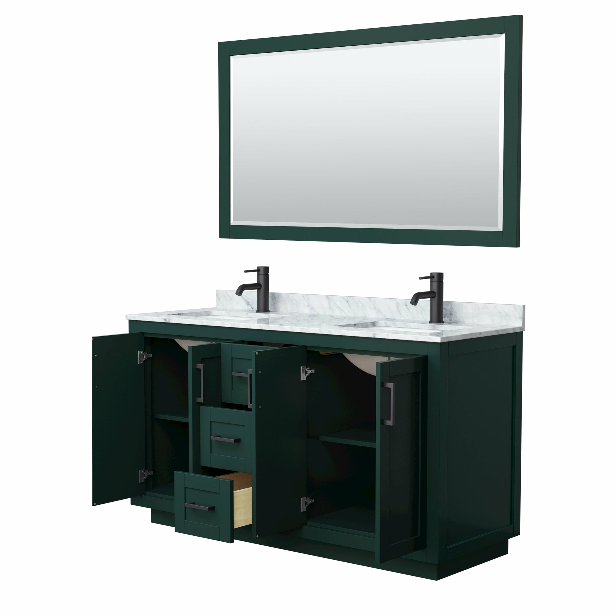 Wyndham Miranda 60 Inch Double Bathroom Vanity in Green, White Carrara Marble Countertop, Undermount Square Sinks, Matte Black Trim, 58 Inch Mirror