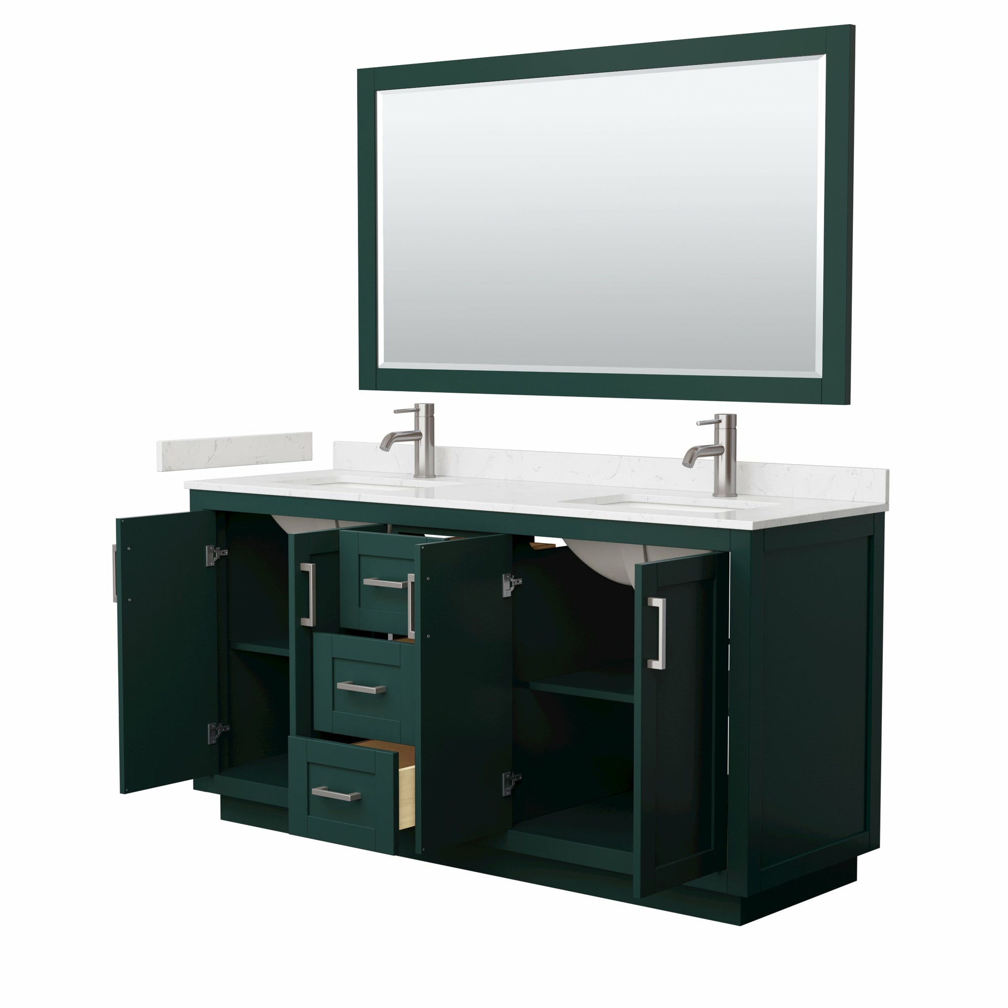 Wyndham Miranda 66 Inch Double Bathroom Vanity in Green, Light-Vein Carrara Cultured Marble Countertop, Undermount Square Sinks, Brushed Nickel Trim, 58 Inch Mirror