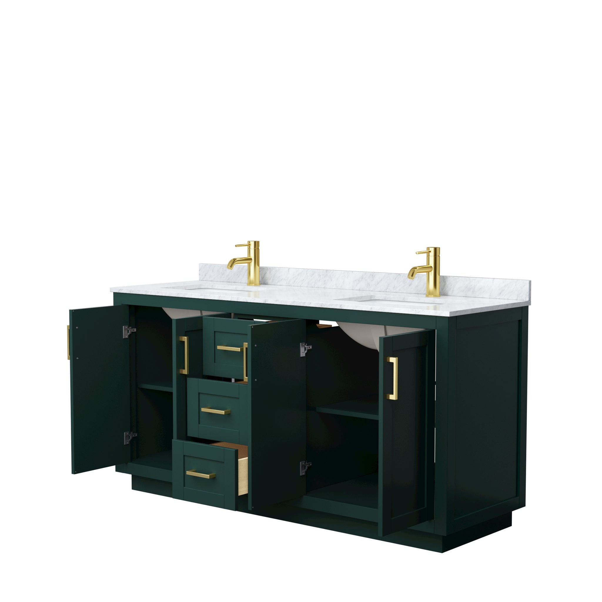 Wyndham Miranda 66 Inch Double Bathroom Vanity in Green, White Carrara Marble Countertop, Undermount Square Sinks, Brushed Gold Trim