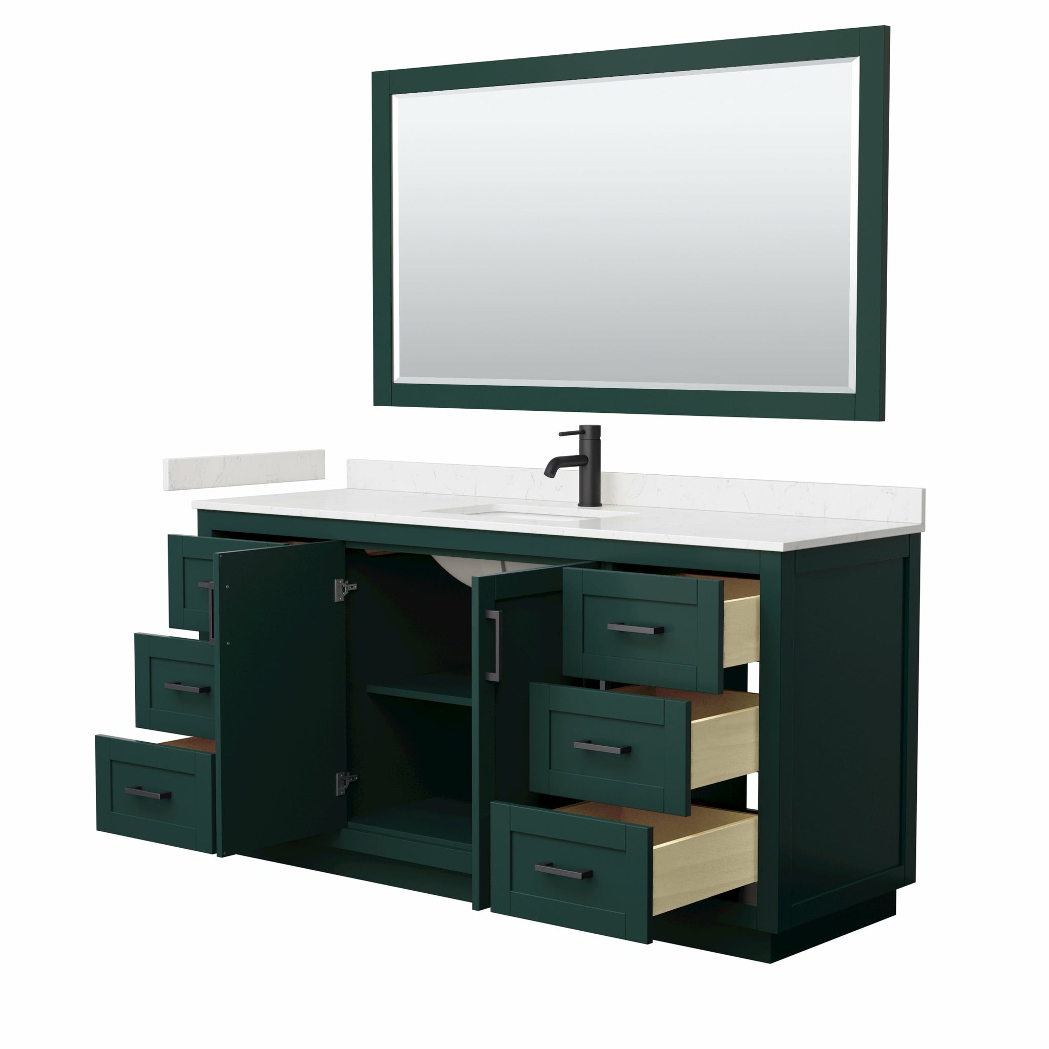 Wyndham Miranda 66 Inch Single Bathroom Vanity in Green, Light-Vein Carrara Cultured Marble Countertop, Undermount Square Sink, Matte Black Trim, 58 Inch Mirror
