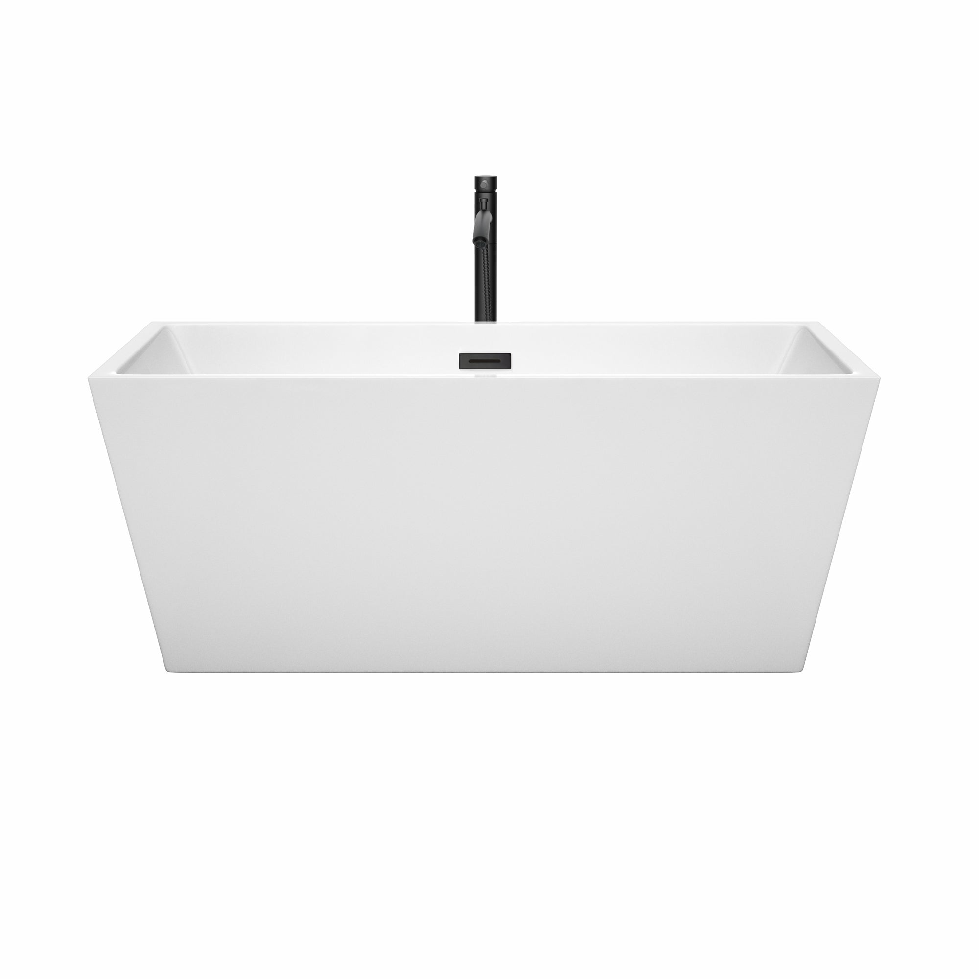 Wyndham Sara 59 Inch Freestanding Bathtub in White with Floor Mounted Faucet, Drain and Overflow Trim in Matte Black