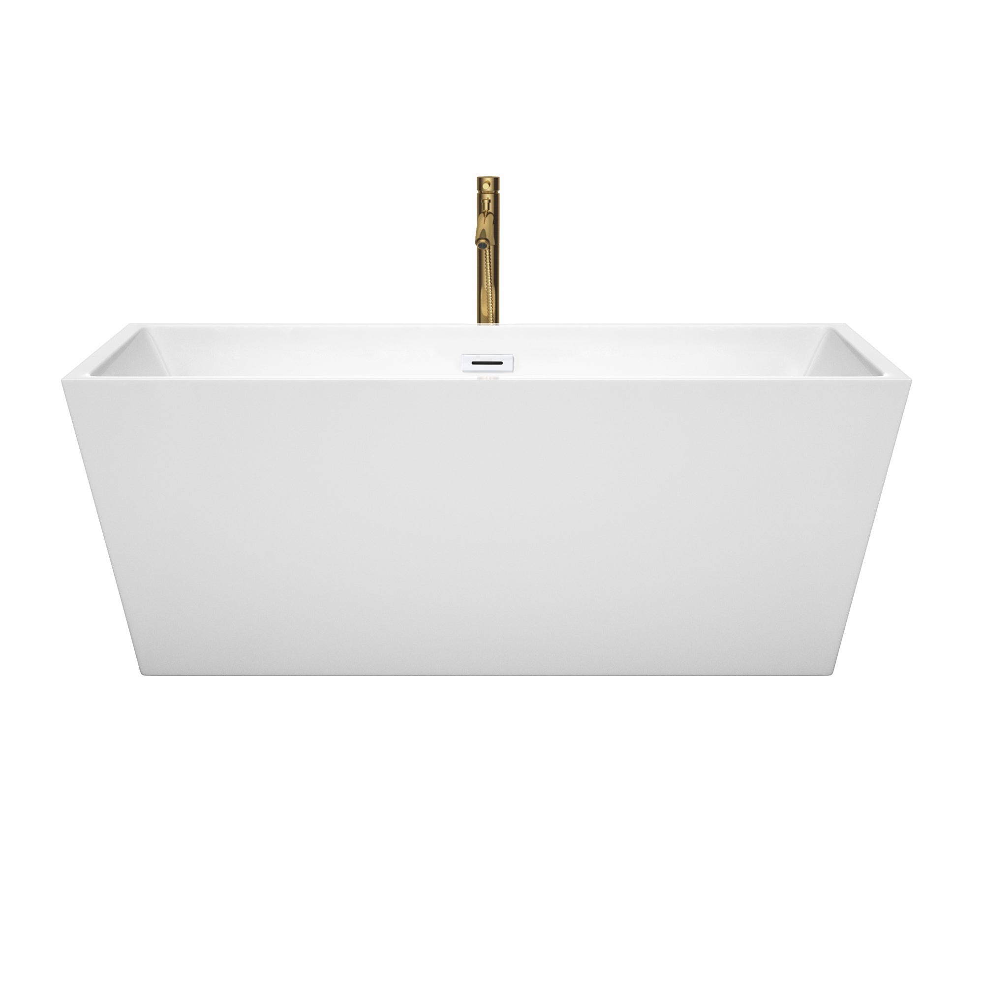 Wyndham Sara 63 Inch Freestanding Bathtub in White with Shiny White Trim and Floor Mounted Faucet in Brushed Gold