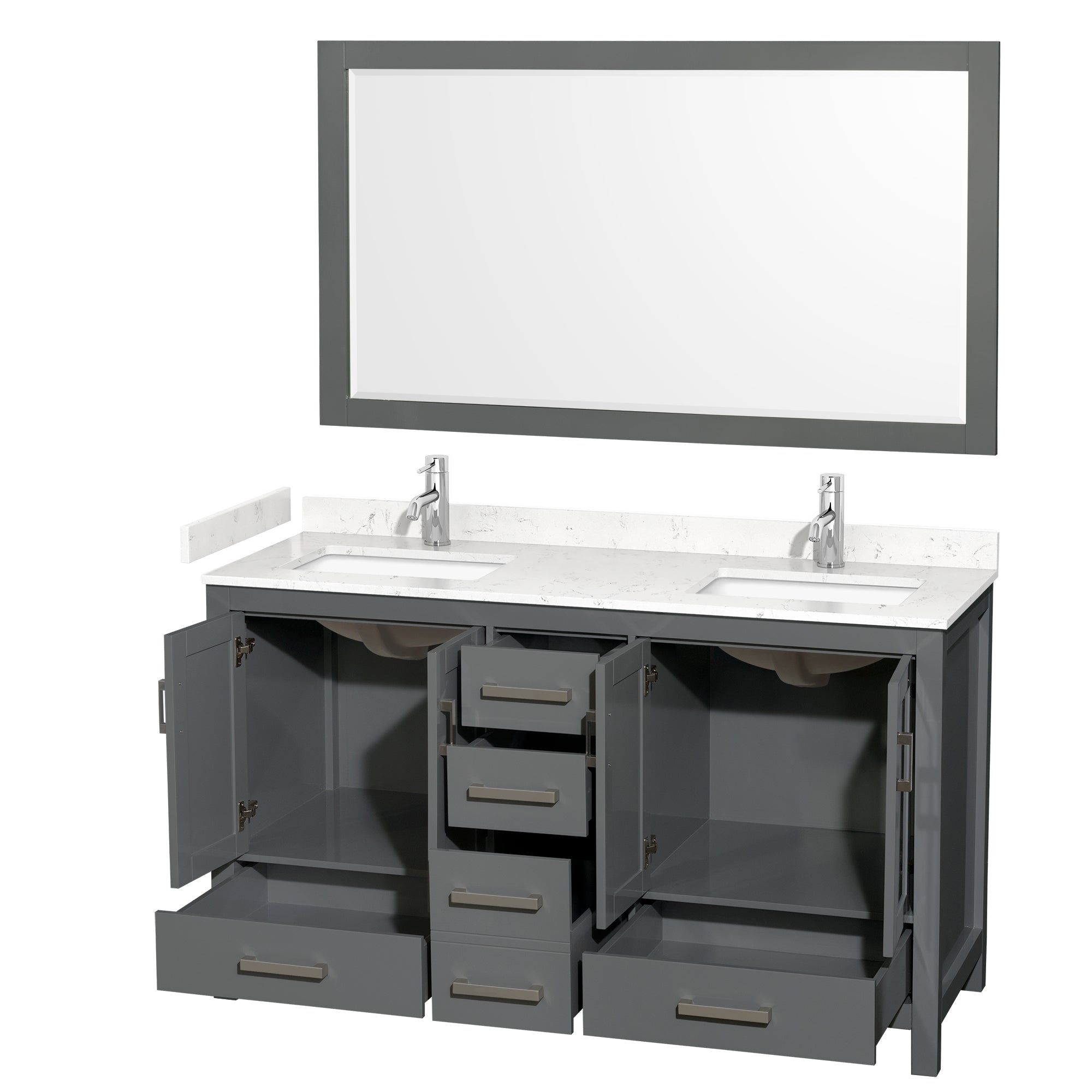 Wyndham Sheffield 60 Inch Double Bathroom Vanity in Dark Gray, Carrara Cultured Marble Countertop, Undermount Square Sinks, 58 Inch Mirror