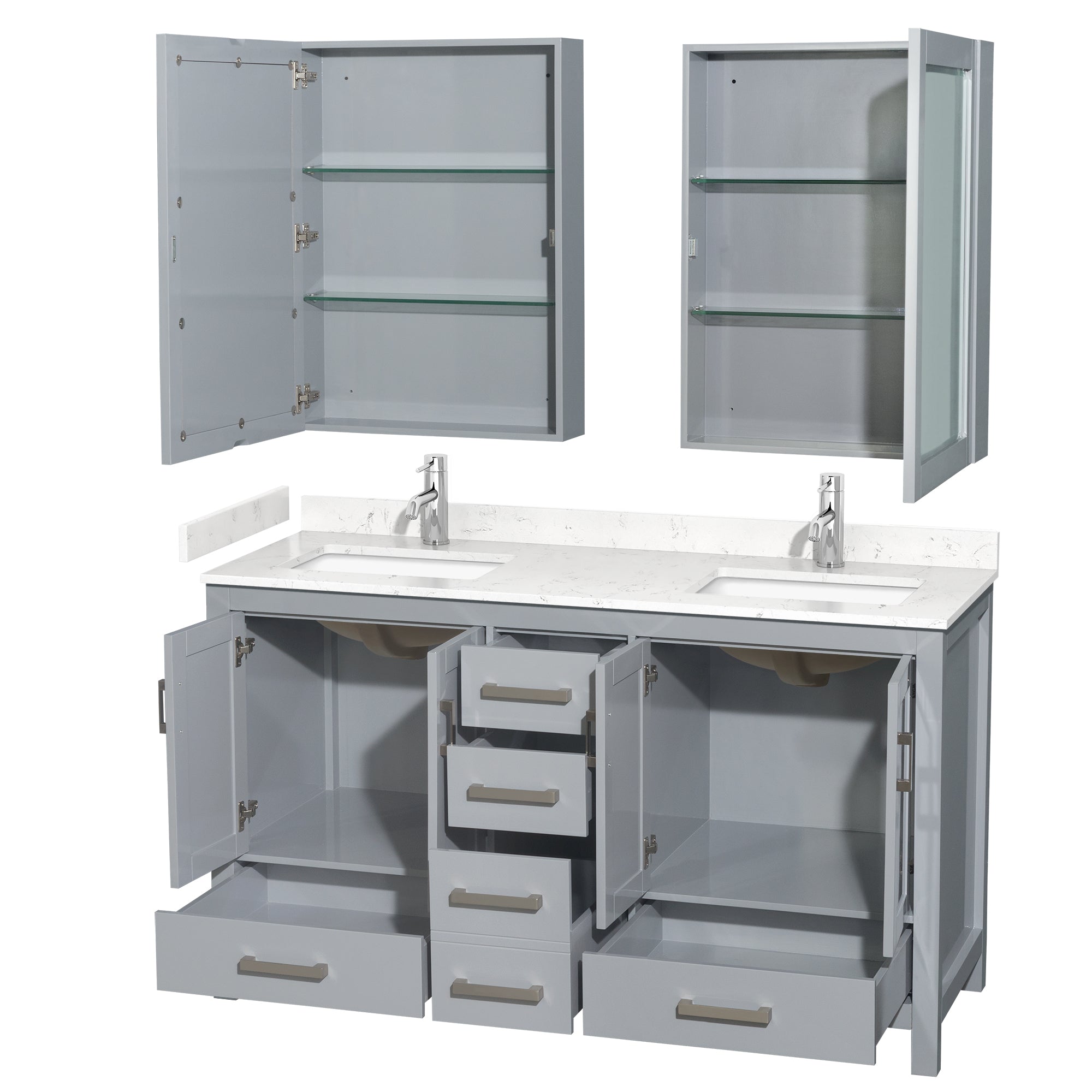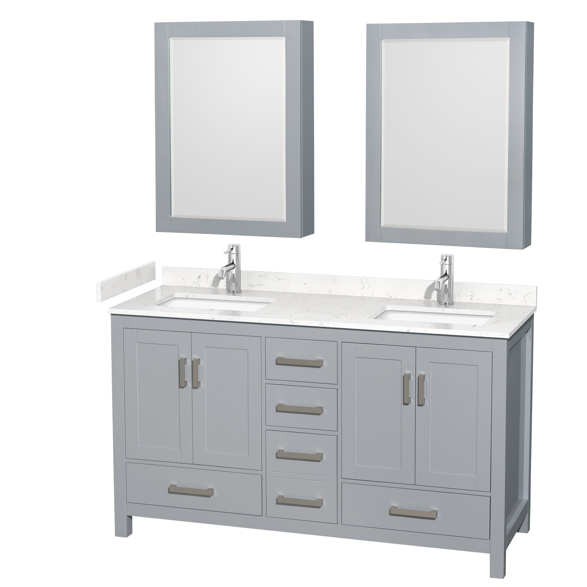 Wyndham Sheffield 60 Inch Double Bathroom Vanity in Gray, Carrara Cultured Marble Countertop, Undermount Square Sinks, Medicine Cabinets
