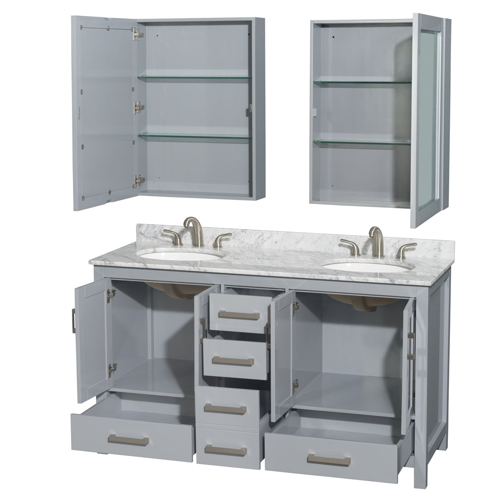 Wyndham Sheffield 60 Inch Double Bathroom Vanity in Gray, White Carrara Marble Countertop, Undermount Oval Sinks, and Medicine Cabinets